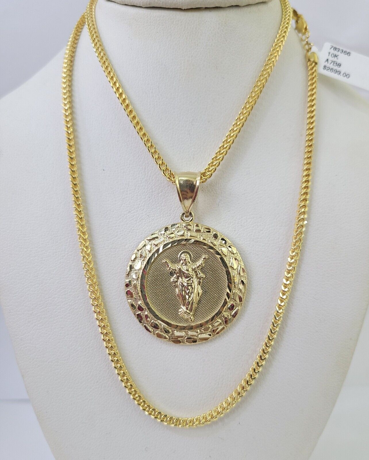 Is Presenting You with This Absolutely Stunning Real 10k Yellow Gold Franco Chain 2.5mm, 20-26 Inches Lobster Lock with Jesus Pendant. The links are 10K GOLD and are very strong. 24"A7B8 A5B7