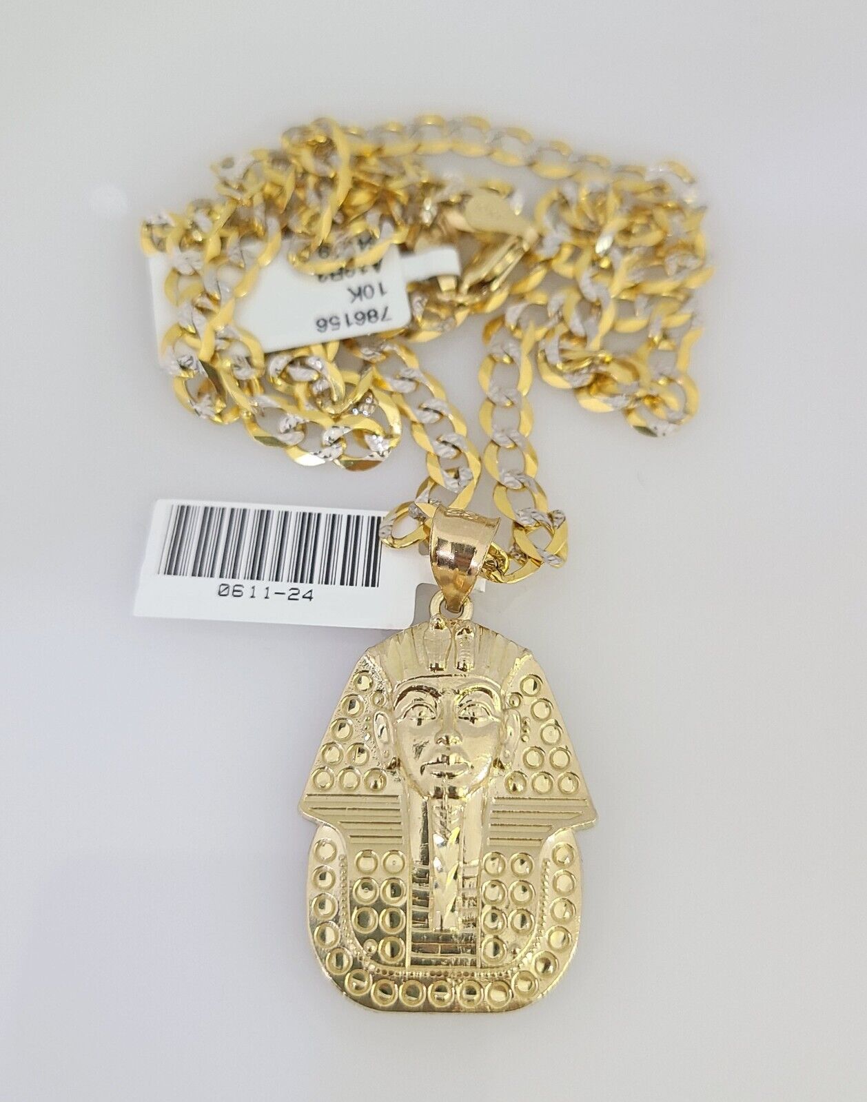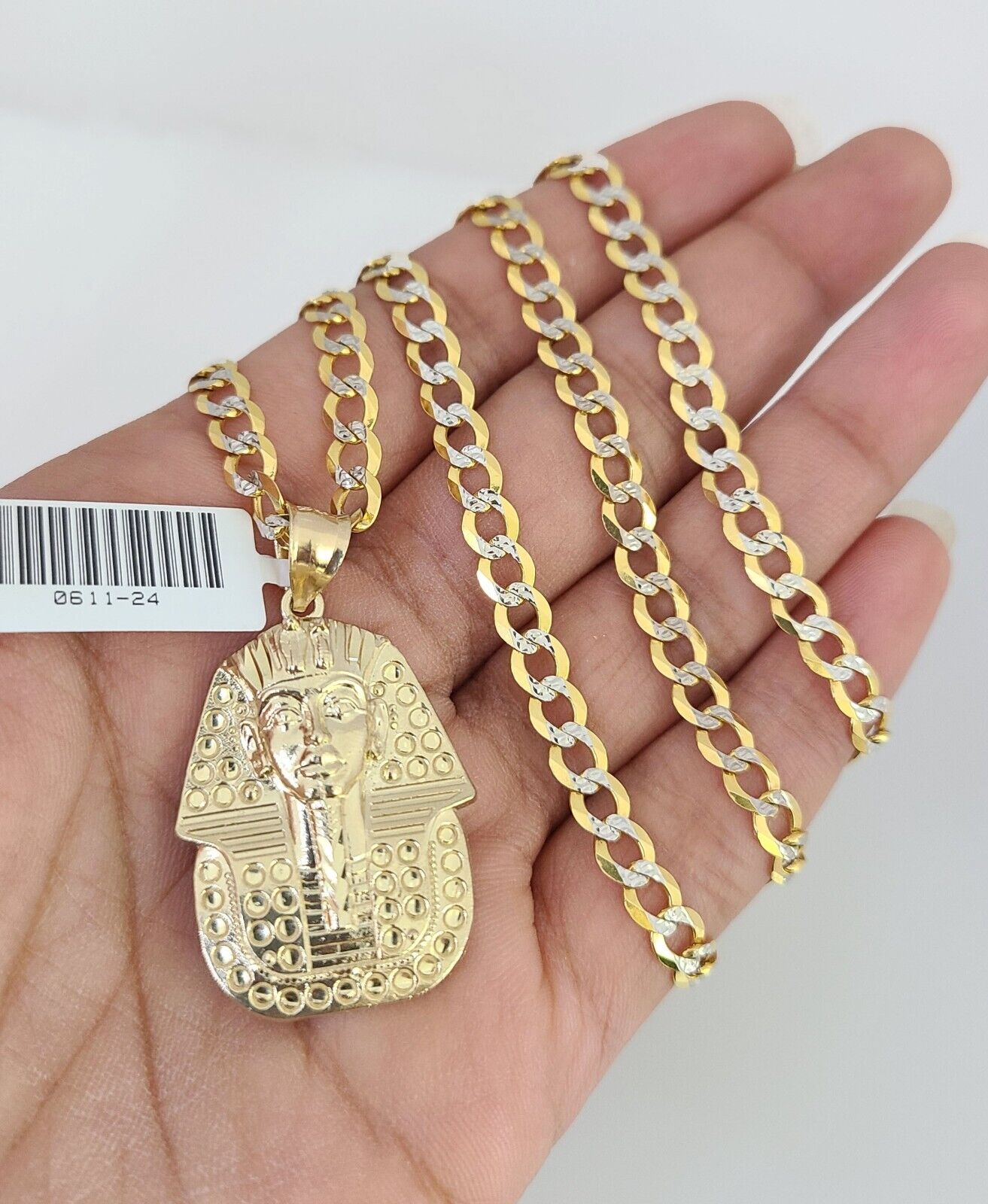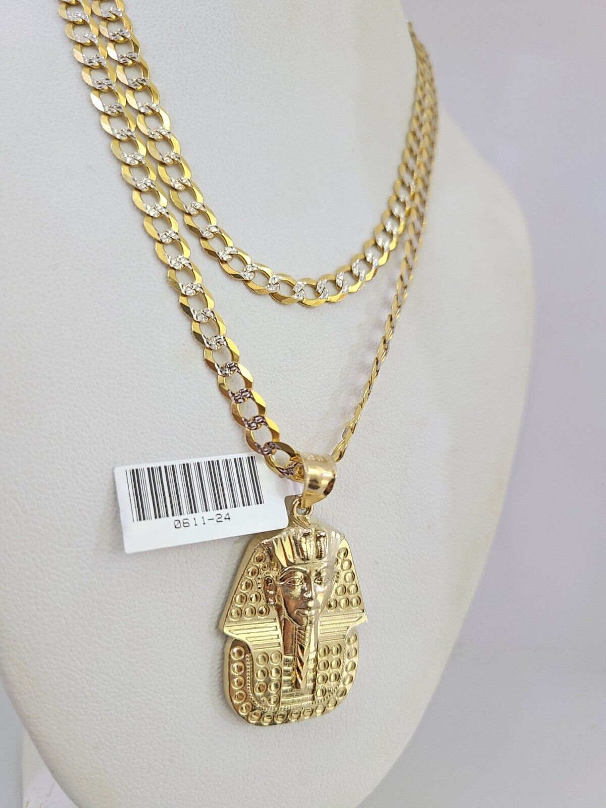 We present You with This Absolutely Stunning Real 10k Yellow Gold SOLID Cuban Curb link Chain Diamond Cut with Pharaoh Charm. It has a detailed cut with a very good finish. These Beautiful Chains will not tarnish, discolor, or fade because they are Pure 10K Gold. Please feel free to contact us if you have any queries regarding the item. 24"-A12B3 A3B1 cal