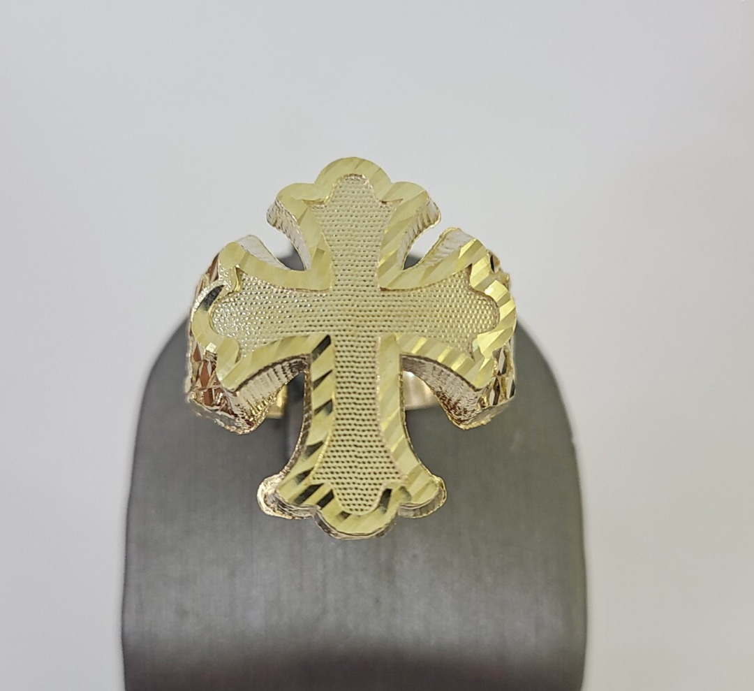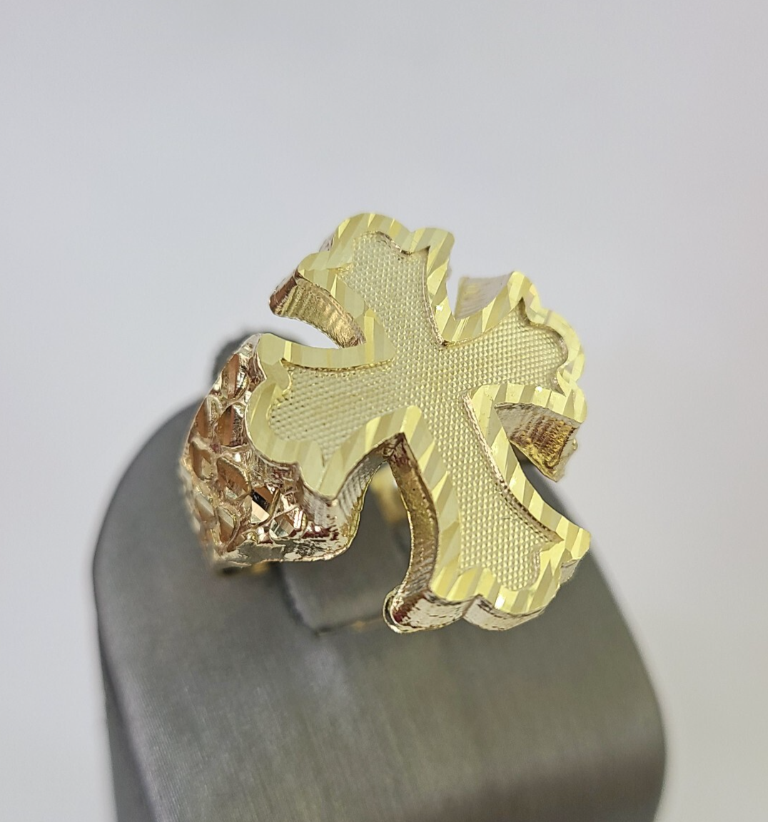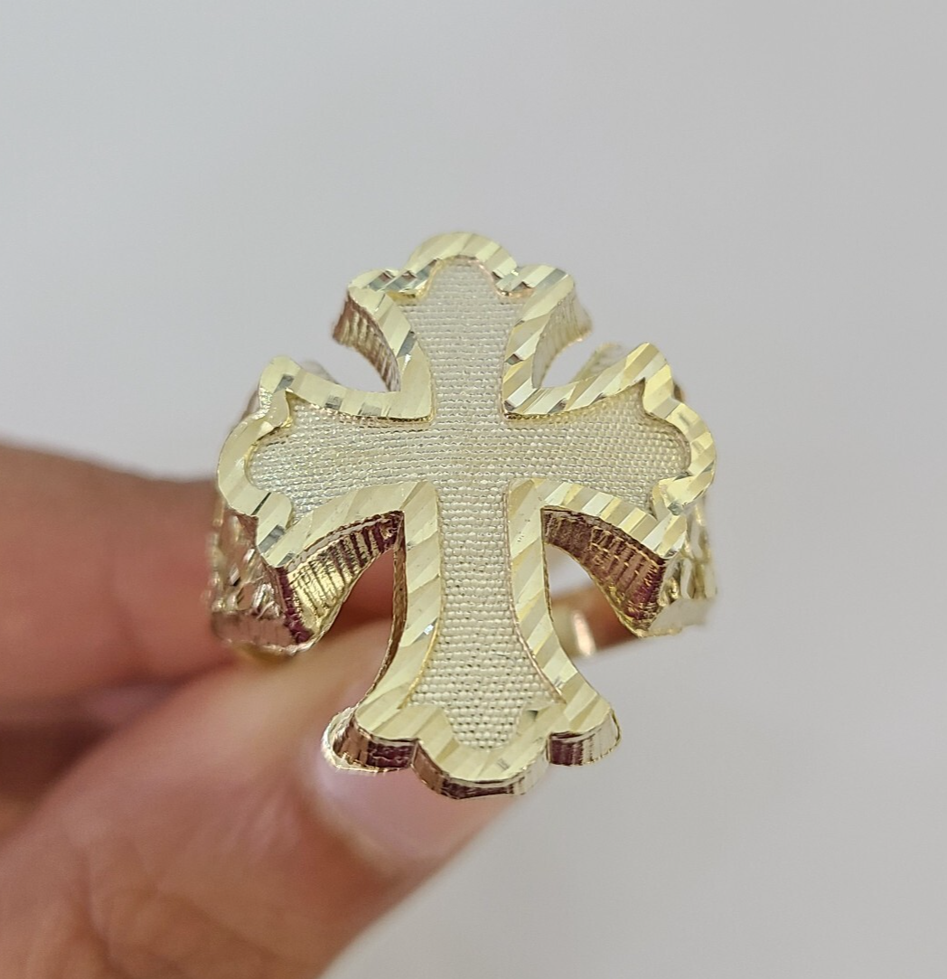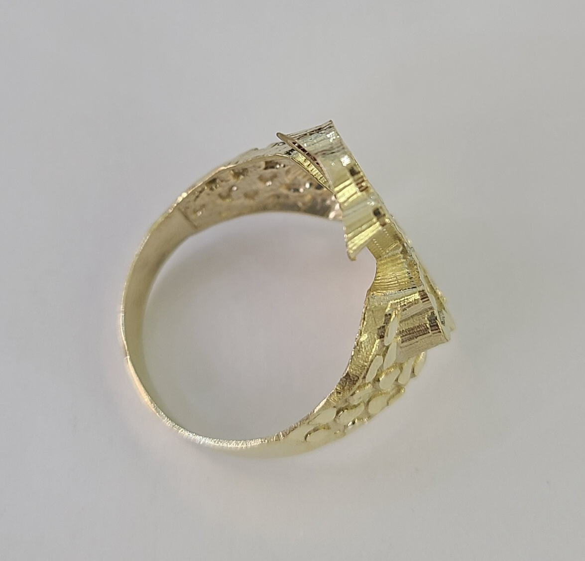 Real 10K Yellow Jesus Cross Nugget Gold Ring. The shape is Round, Traditional and Classic & Timeless. It flaunts Extra ordinary Design ring. It comes with standard size 13, and the ring is sizable. Sizing the ring will cost you extra $19.99 on your demand.
