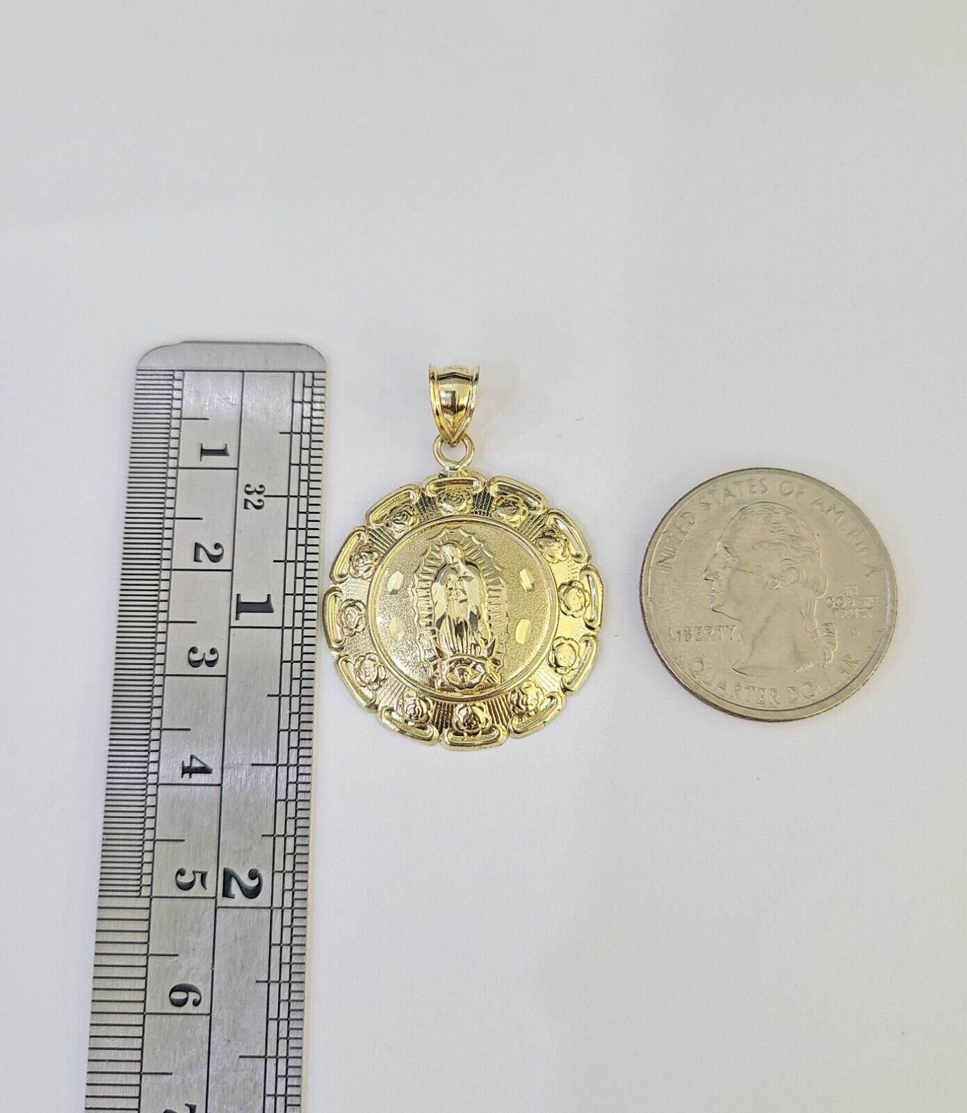 Is Presenting You with This Absolutely Stunning Real 10k Yellow Gold Miami Cuban Link Chain 4mm, 18 inch- 28 inches, Lobster Lock with a 10k Virgin Mary Charm Pendant. The pendant is 1-1.5 inch long (approx.). These Beautiful chains and Pendant will not tarnish, discolor, or fade because they are Pure 10K Gold. 24"-A8B7 A2B6