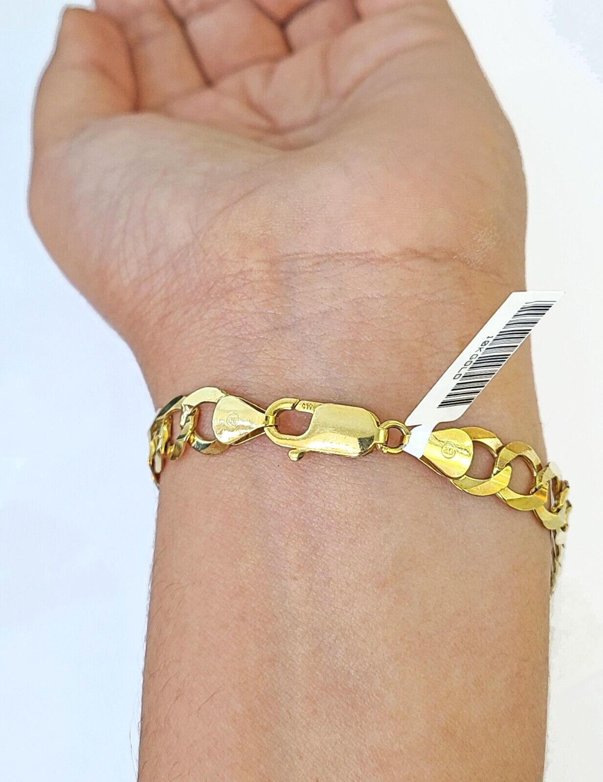 Is Presenting You with This Absolutely Stunning Real 10k Solid Yellow Gold Cuban Curb Link Bracelet 8mm,8 Inches, Lobster Lock. The links are 10K GOLD and are very strong and have a box lock with the two safety clasp on sides. These Beautiful bracelets will not tarnish, discolor, or fade because they are Pure 10K Gold. We also have them in various another length. Please feel free to contact us if you have any queries regarding the item.