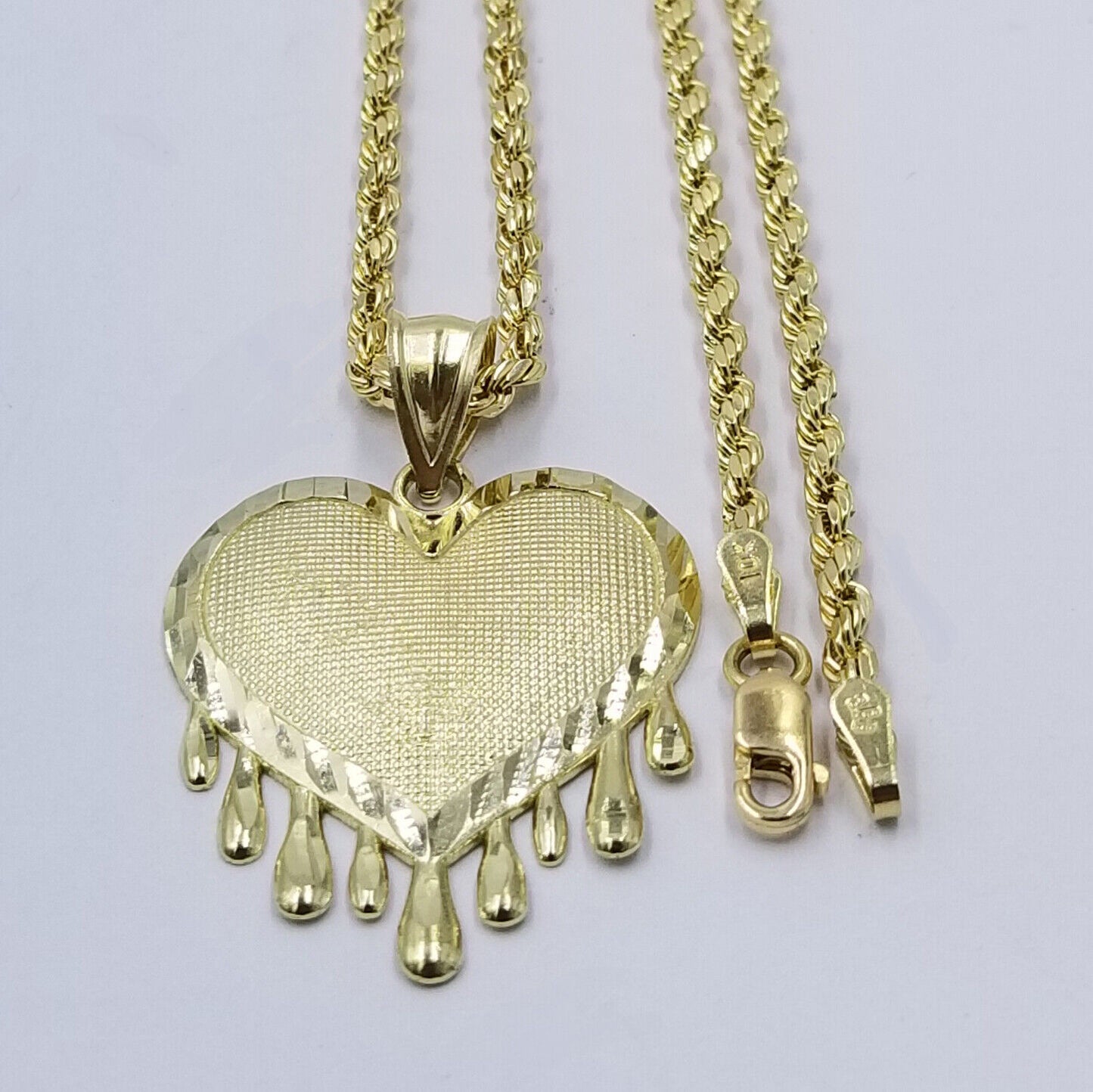 Is Presenting You with This Absolutely Stunning Real 10k Yellow Gold Rope Chain 2.5mm 18" Inch-24 Inches, Lobster Lock with 10k gold Heart pendant. These Beautiful chains and pendants will not tarnish, discolor, or fade because they are Pure 10K Gold. We also have them in various another length. Please feel free to contact us if you have any queries regarding the item.