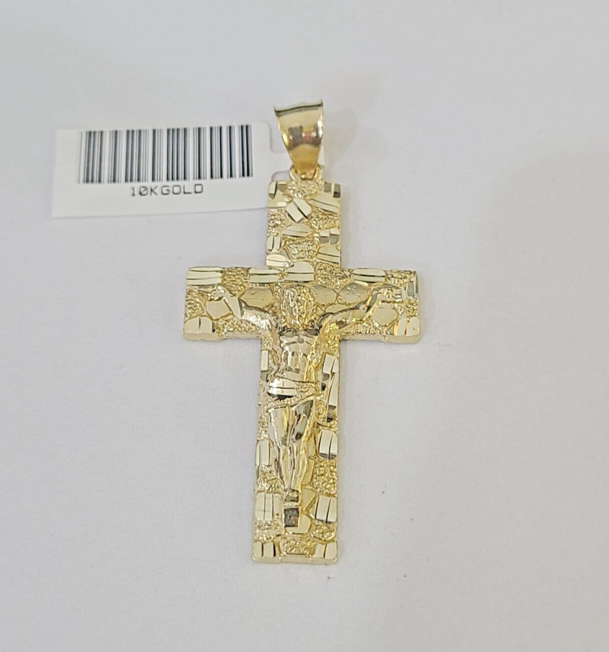 Is Presenting You with This Absolutely Stunning Real 10k Yellow Gold Miami Cuban Link Chain 4mm, 18 inch- 26 inches, Lobster Lock with a 10k cross charm Pendant. The pendant is 2 inch long (approx.). These Beautiful chains and Pendant will not tarnish, discolor, or fade because they are Pure 10K Gold. We also have them in various another length and sizes.