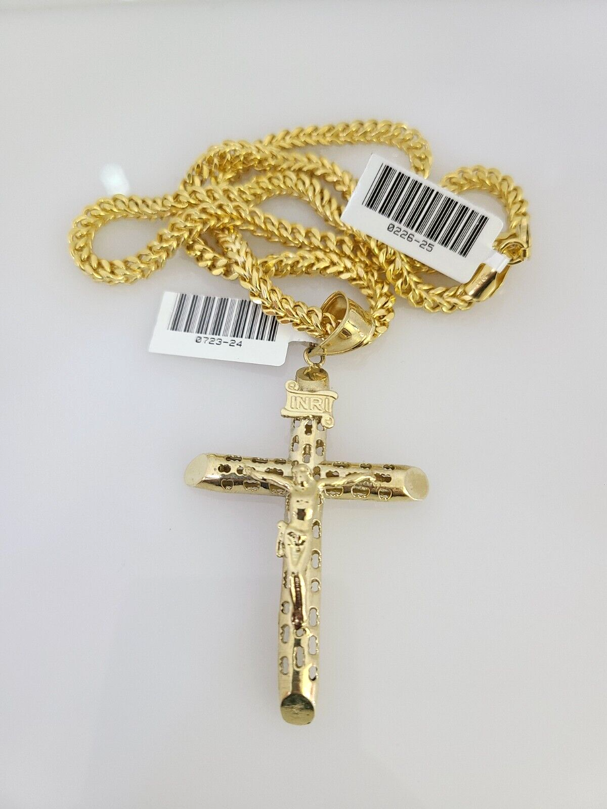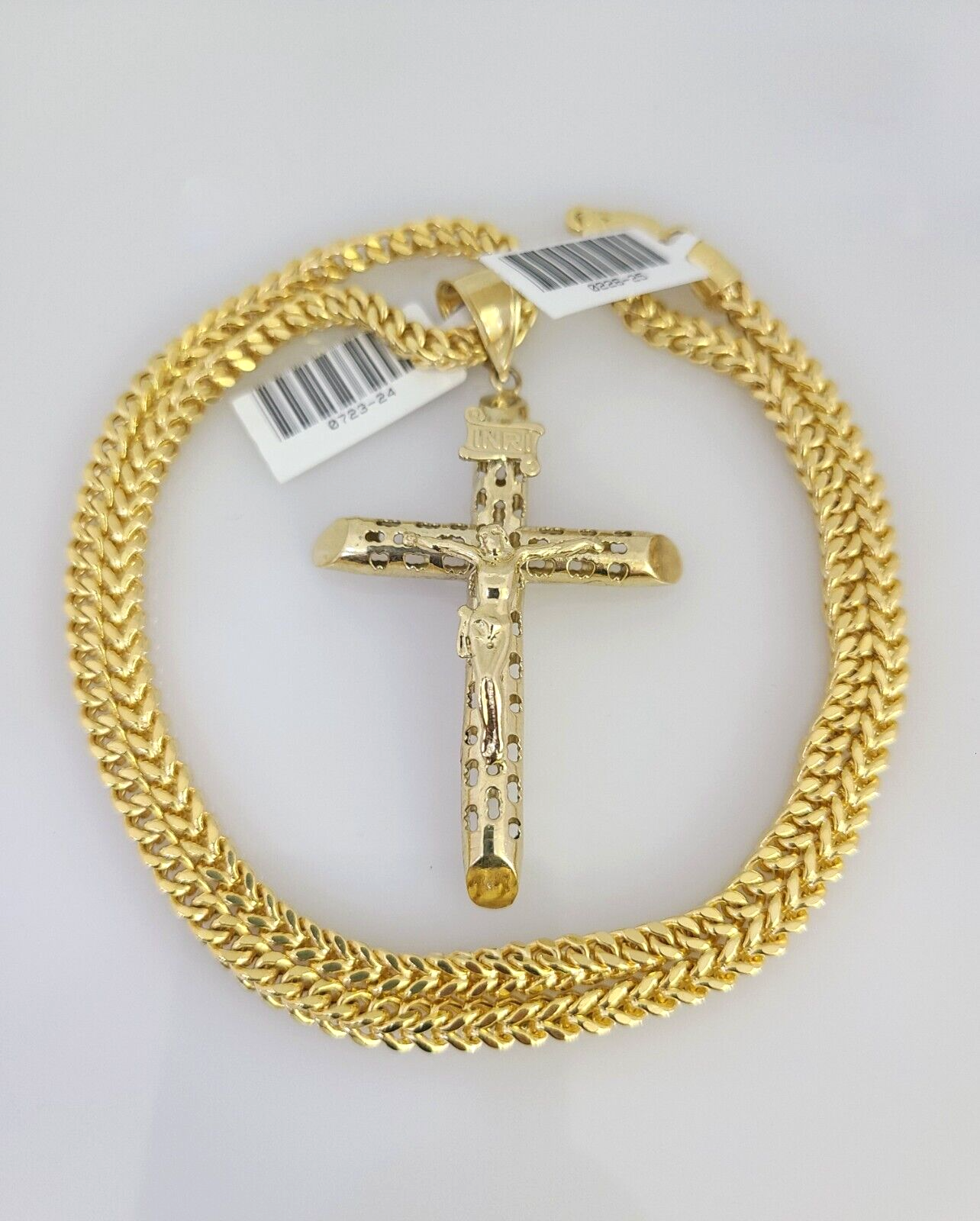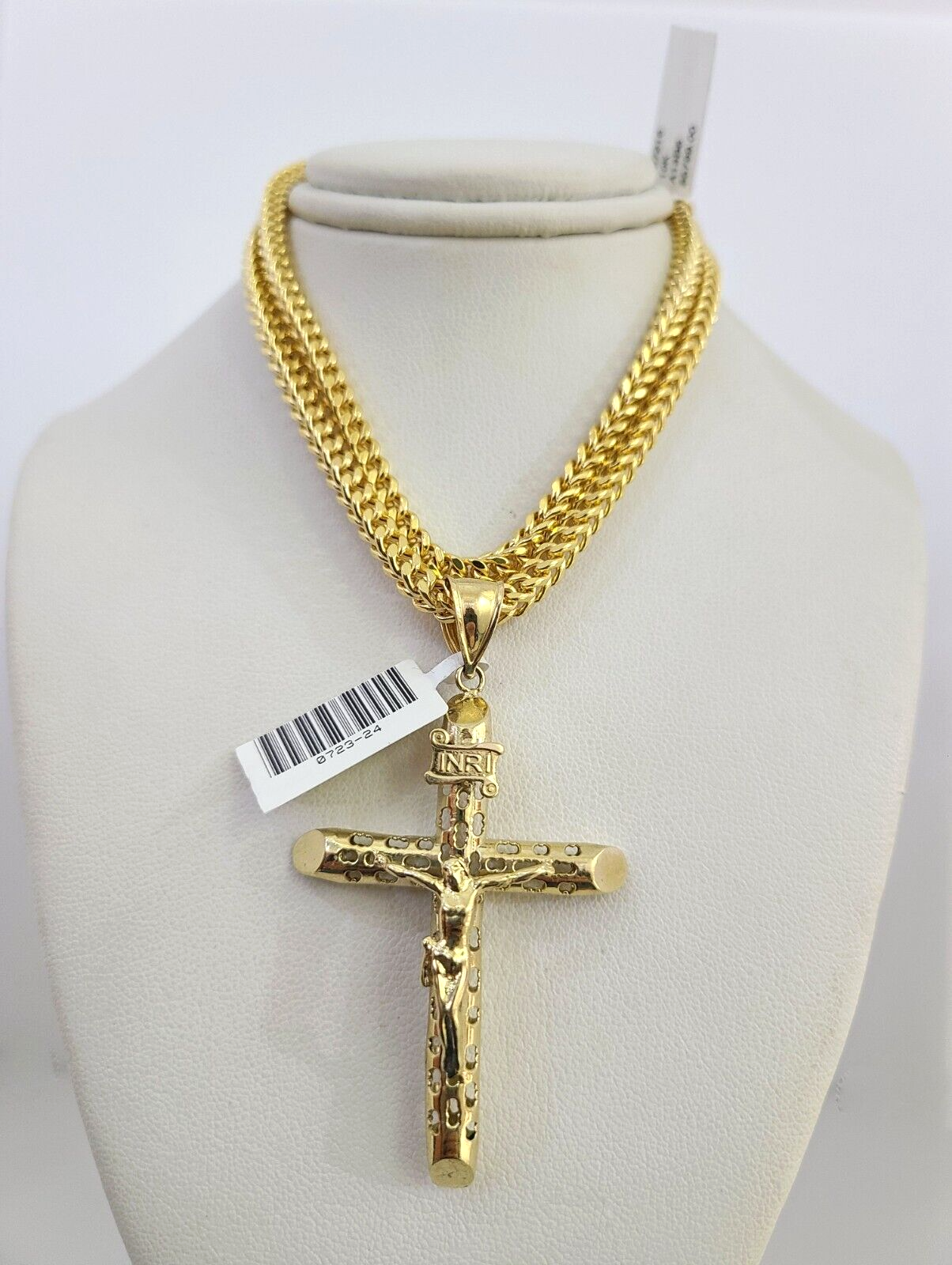Genuine 10k Yellow Gold Franco Necklace 4mm Franco Chain with INRI Jesus Cross Charm. The Various length of the Chain are 18"-28" with INRI Jesus Cross Charm. The pendants are unique in design and considered durable too. If you are not happy with the way it looks or feels, we do offer 30 - Days FREE Return shipping. Contact us for more information.