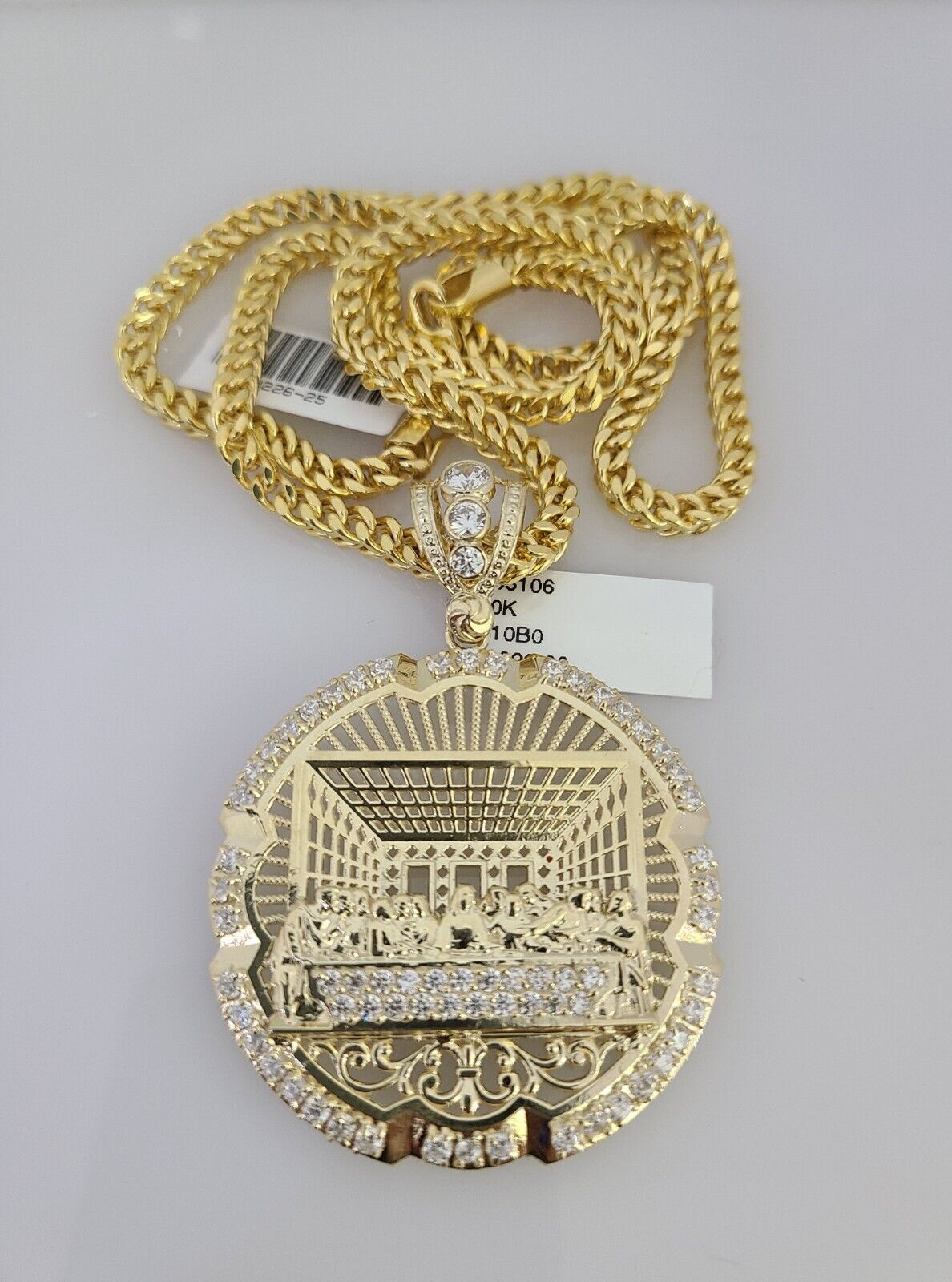 Genuine 10k Yellow Gold Franco Necklace 4mm Franco Chain with Last Supper Charm. The Various length of the Chain are 18"-28" with Last Supper Charm. The pendants are unique in design and considered durable too. If you are not happy with the way it looks or feels, we do offer 30 - Days FREE Return shipping. Contact us for more information.