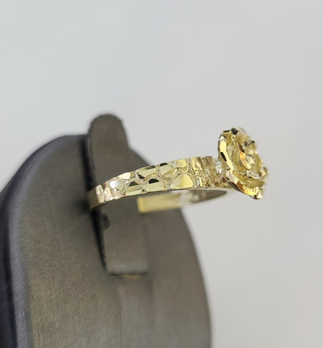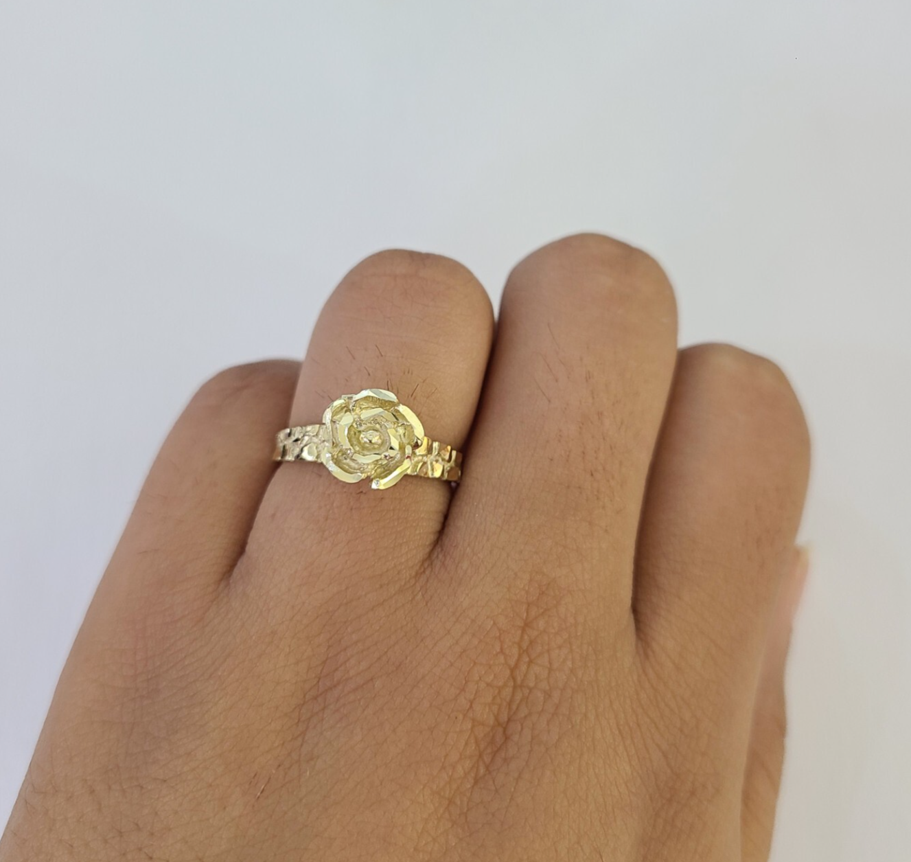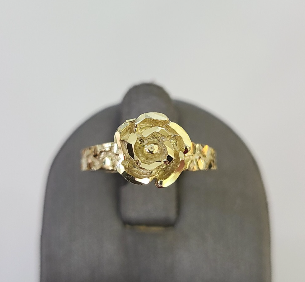 Real 10K Yellow Rose Flower Nugget Gold Ring. The shape is Round, Traditional and Classic & Timeless. It flaunts Extra ordinary Design ring. It comes with standard size 6.5, and the ring is sizable. Sizing the ring will cost you extra $19.99 on your demand.