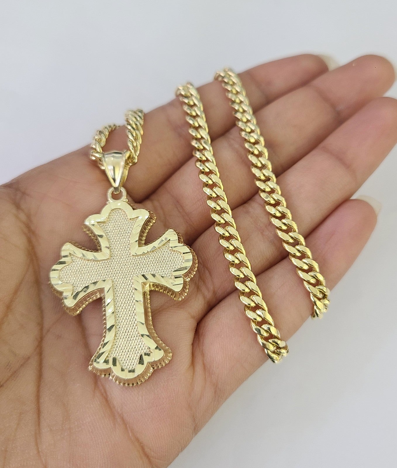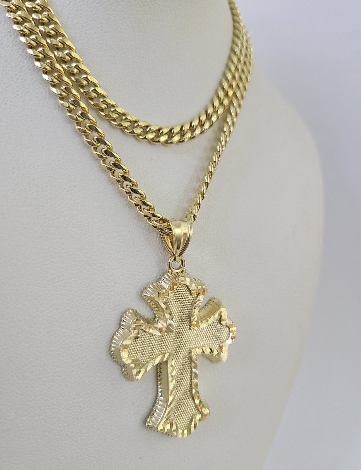 Genuine 10k Yellow Gold Miami Cuban Necklace 5mm Chain with Jesus Roman Cross Charm. The Various length of the Chain are 18"-28" with Jesus Roman Cross Charm. The pendants are unique in design and considered durable too. If you are not happy with the way it looks or feels, we do offer 30 - Days FREE Return shipping. Contact us for more information.