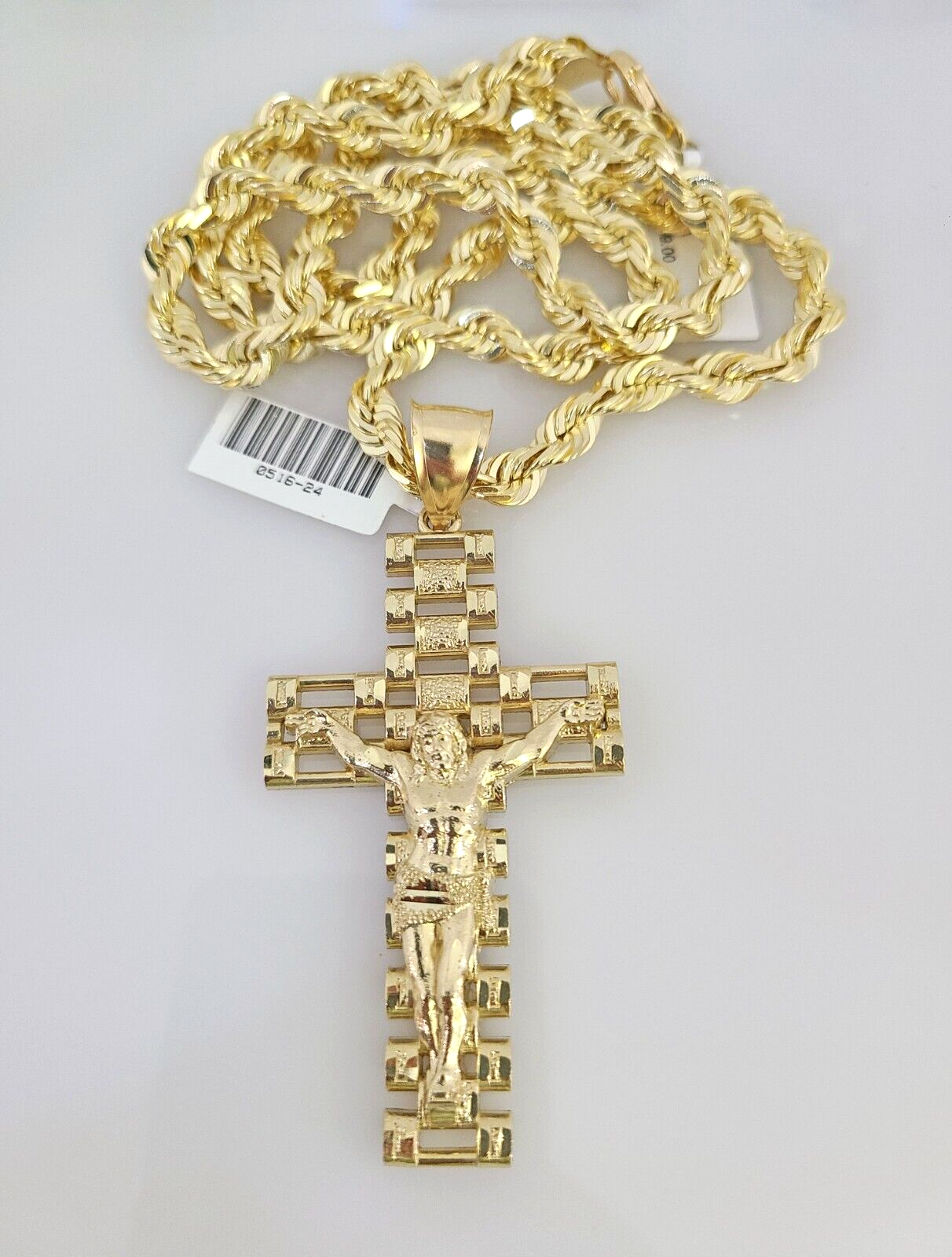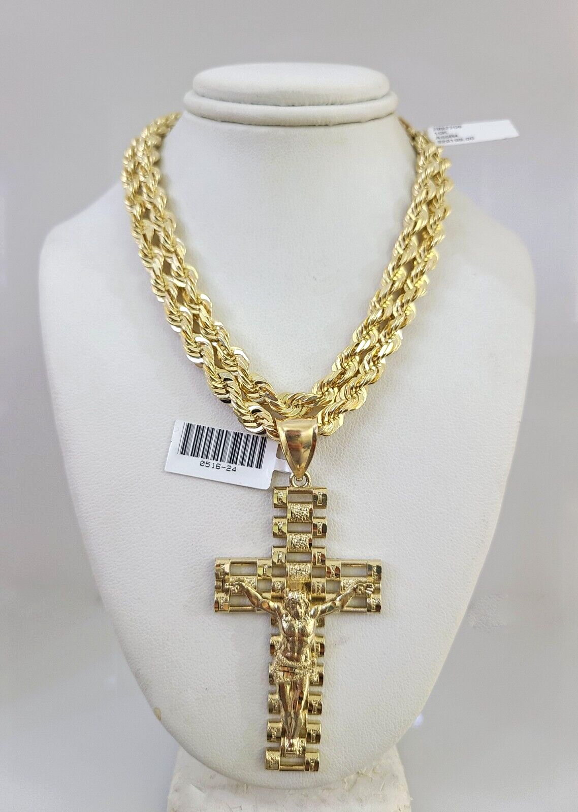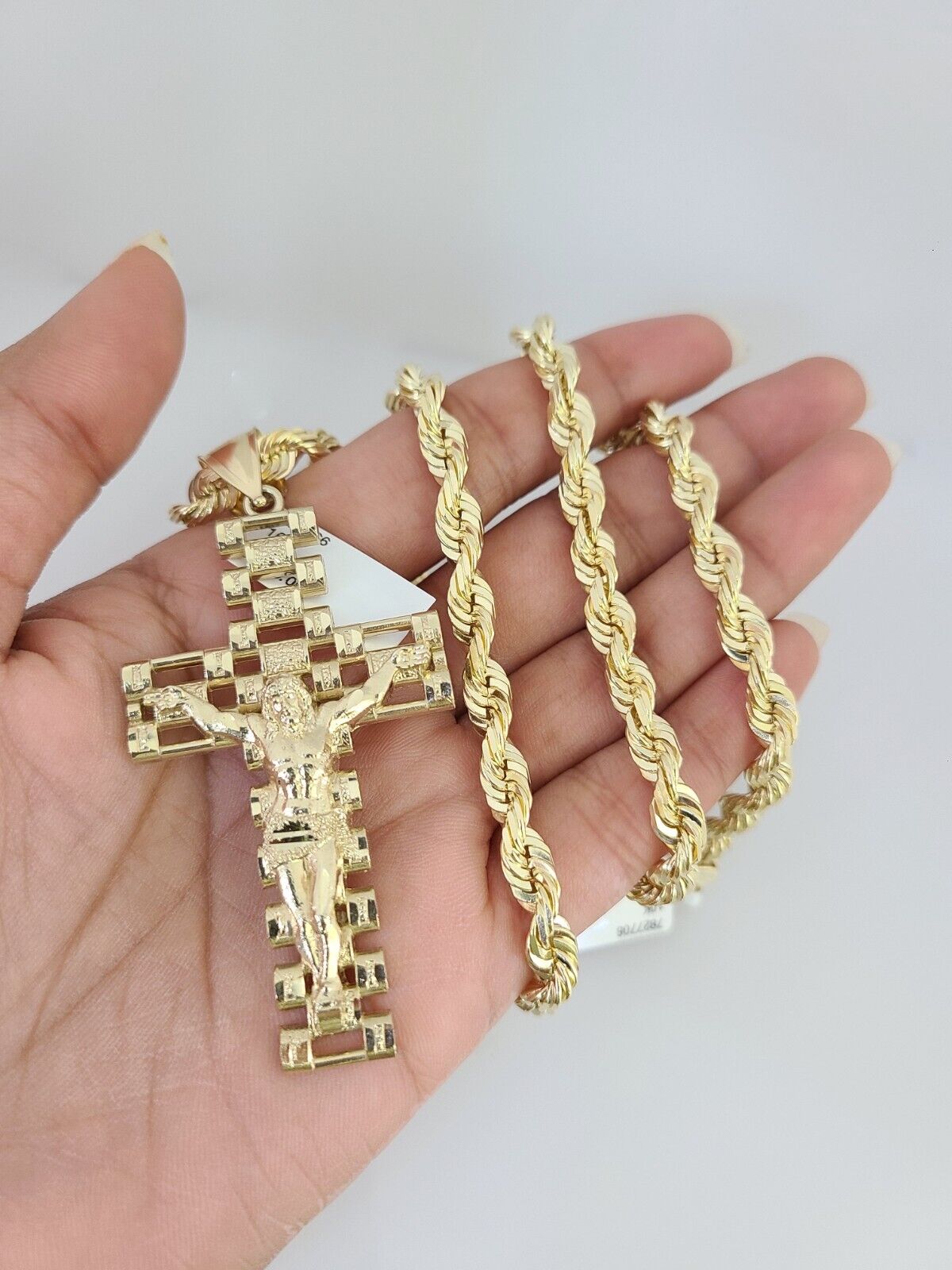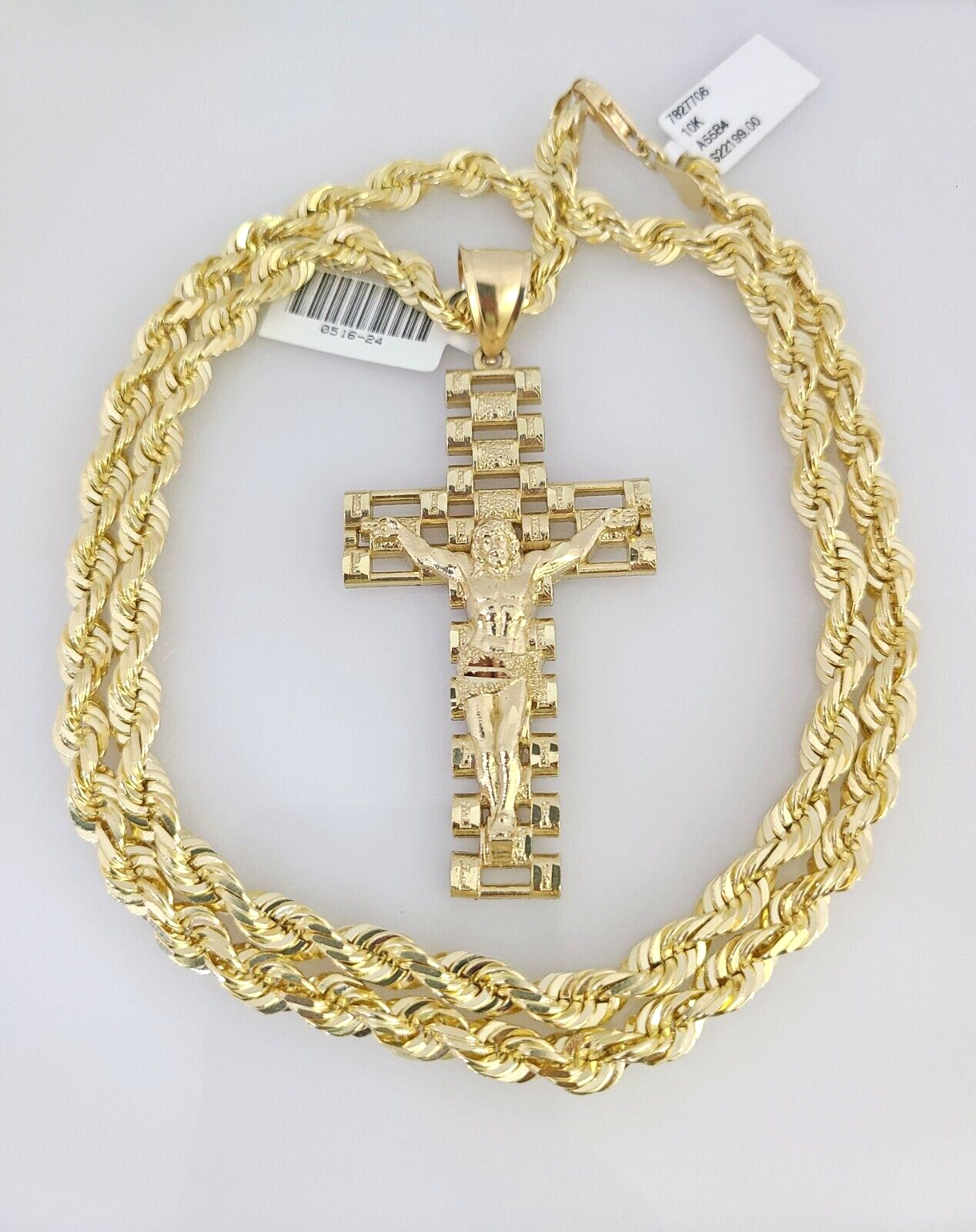 Genuine 10k Yellow Gold Solid Rope Chain 18-30 Inch 6mm Necklace with Jesus Cross Charm design as a SET. The Various length of the Chain are 18-30 Inches. If you are not happy with the way it looks or feels, we do offer 30 - Days FREE Return shipping. Contact us for more information.