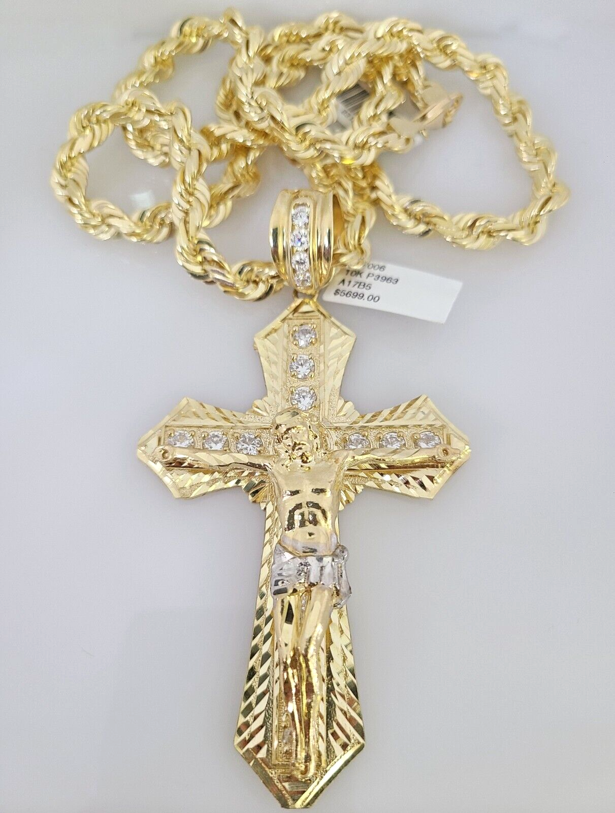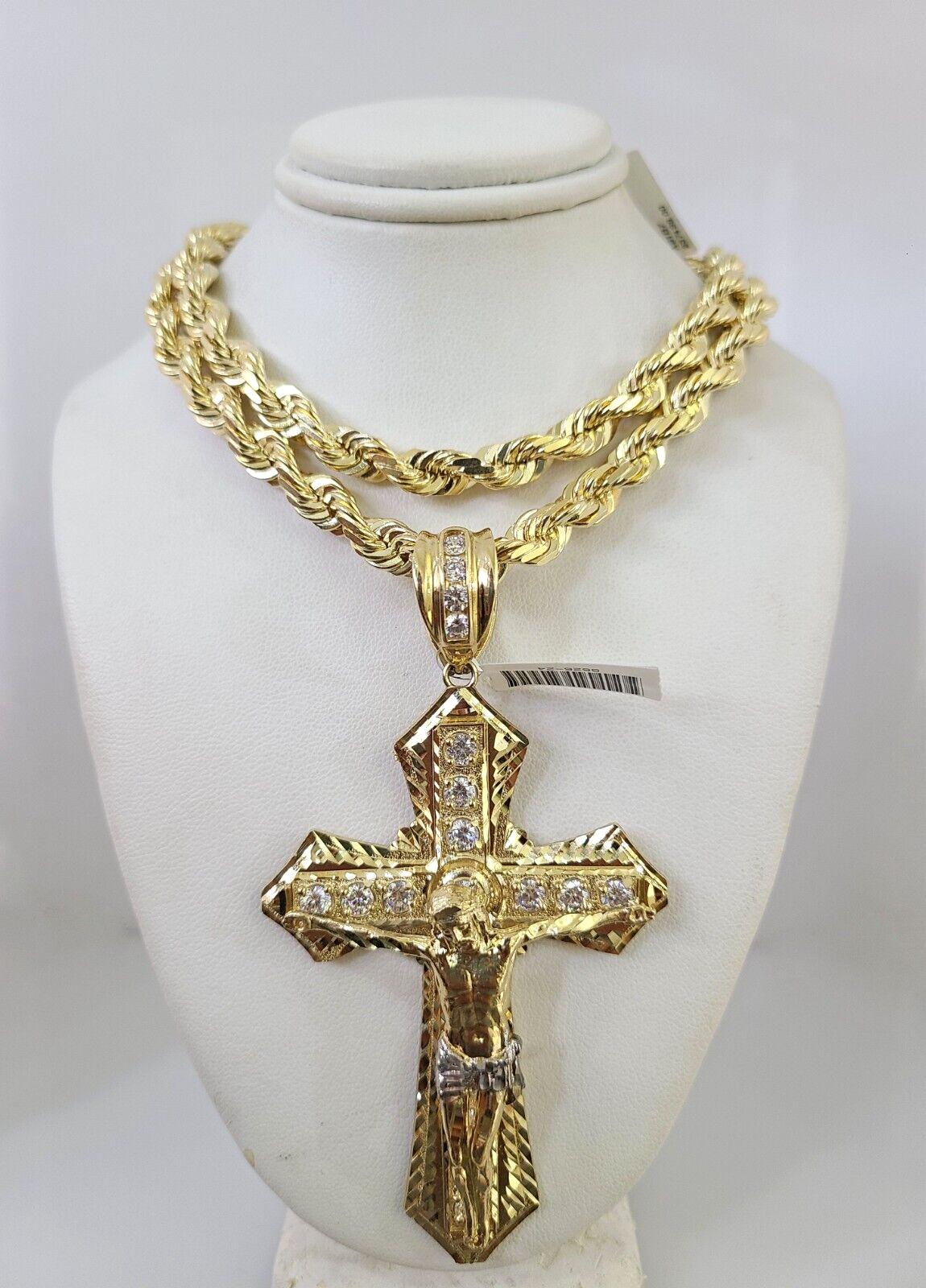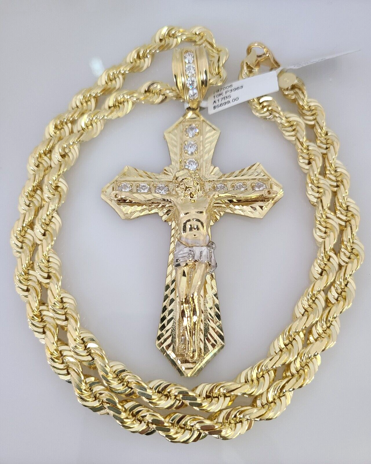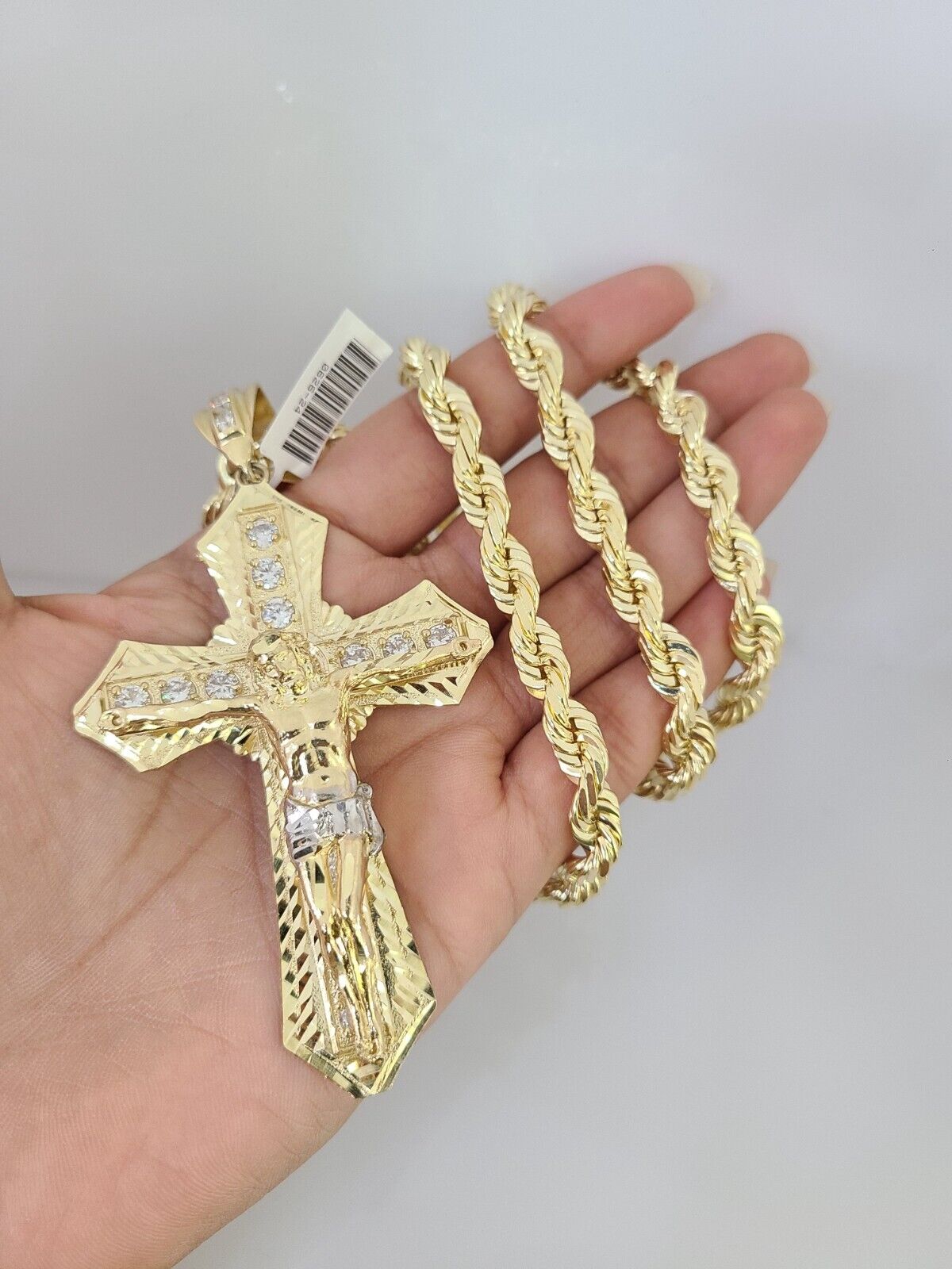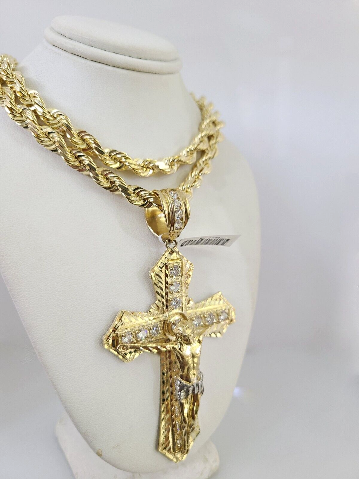 Genuine 10k Yellow Gold Solid Rope Chain 18-30 Inch 7mm Necklace with Jesus Cross Charm design as a SET. The Various length of the Chain are 18-30 Inches. If you are not happy with the way it looks or feels, we do offer 30 - Days FREE Return shipping. Contact us for more information.
