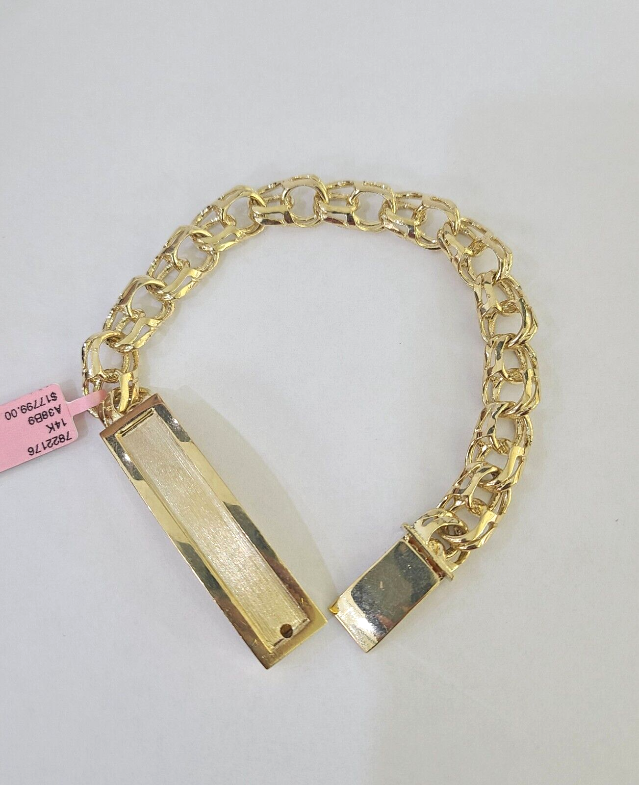 Is Presenting You with This Absolutely Stunning Real 14K Yellow Gold CHINO I'D BRACELET, 8.5 Inches, Hand Chain-9mm ID-11mm BOX Lock. The links are very strong and made up of 14K. These Beautiful Bracelets will not tarnish, discolor, or fade because they are Pure 14K Gold.We also have them in various lengths. Please feel free to contact us if you have any queries regarding the item. A38B9