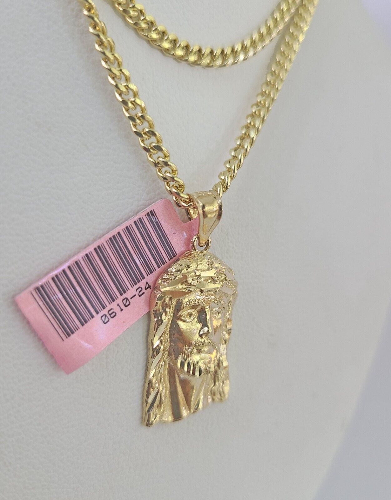 Is Presenting You with This Absolutely Stunning Real 14k Yellow Gold Miami Cuban Link Chain 3mm, 18inch-28inches, Lobster Lock with a 14k Jesus Head Charm Pendant. These Beautiful chains and Pendant will not tarnish, discolor, or fade because they are Pure 14K Gold. We also have them in various another length and sizes. 20"-A5B5 A1B9CAL