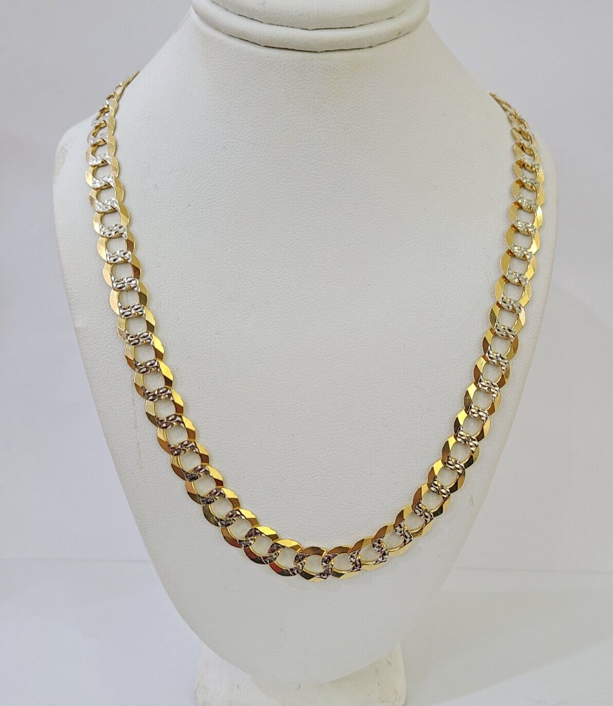 We present You with This Absolutely Stunning Real 14k Yellow Gold SOLID cuban curb link chain with two-tone rhodium diamond cuts. It has a detailed cut with a very good finish. These Beautiful Chains will not tarnish, discolor, or fade because they are Pure 14K Gold. Please feel free to contact us if you have any queries regarding the item.