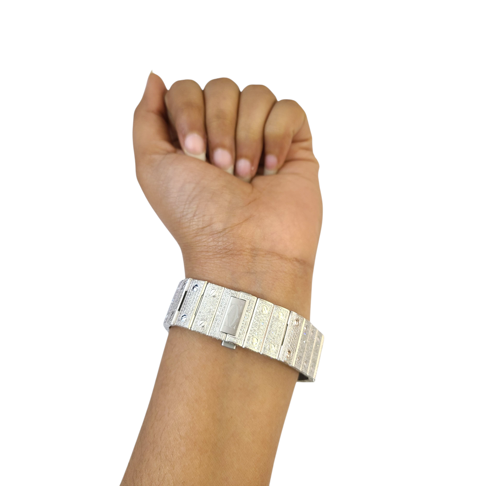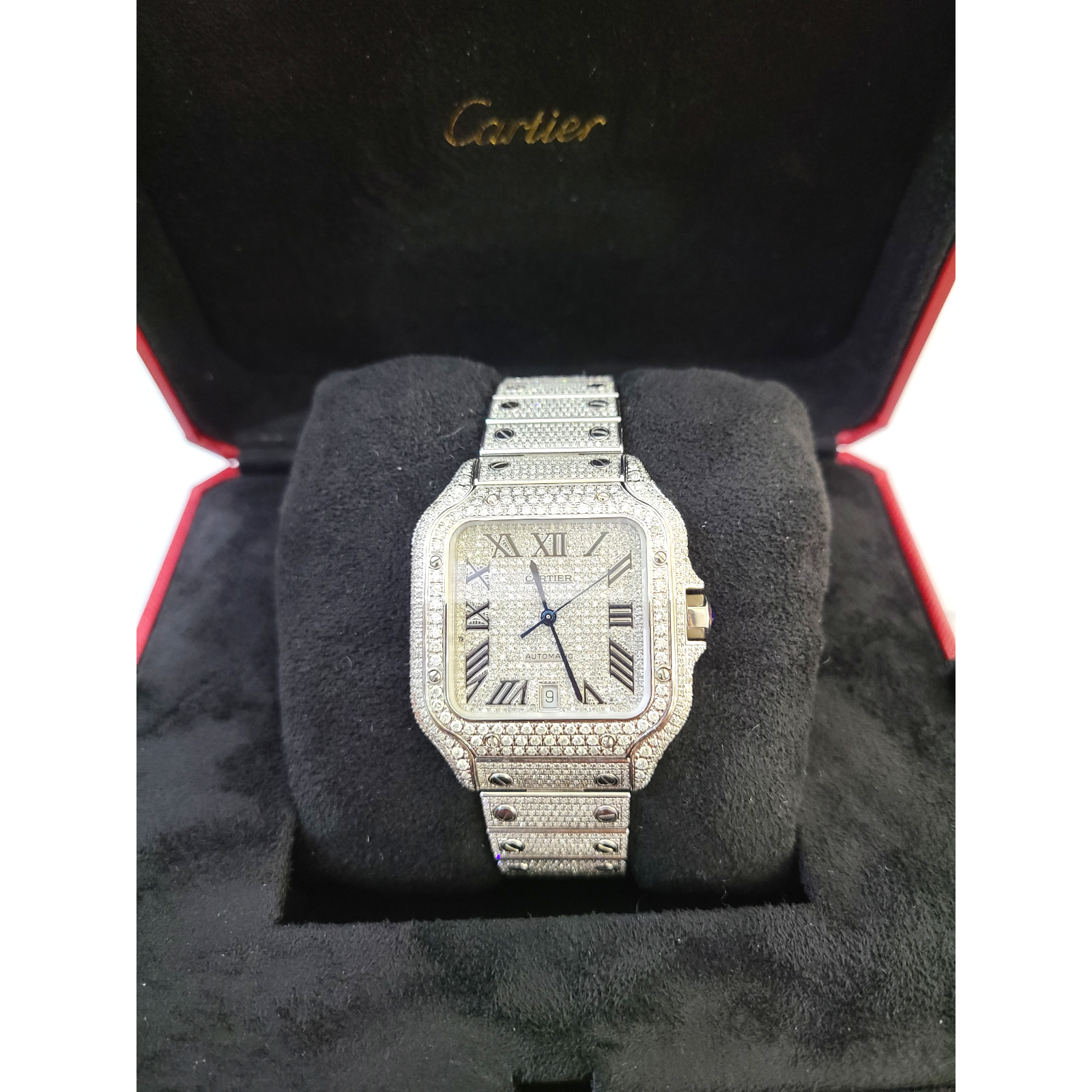 This is a 38.8 mm Stainless steel Cartier watch with Genuine Natural Diamonds of Total weight 12CT with Aftermarket dial , Bazel and a case.