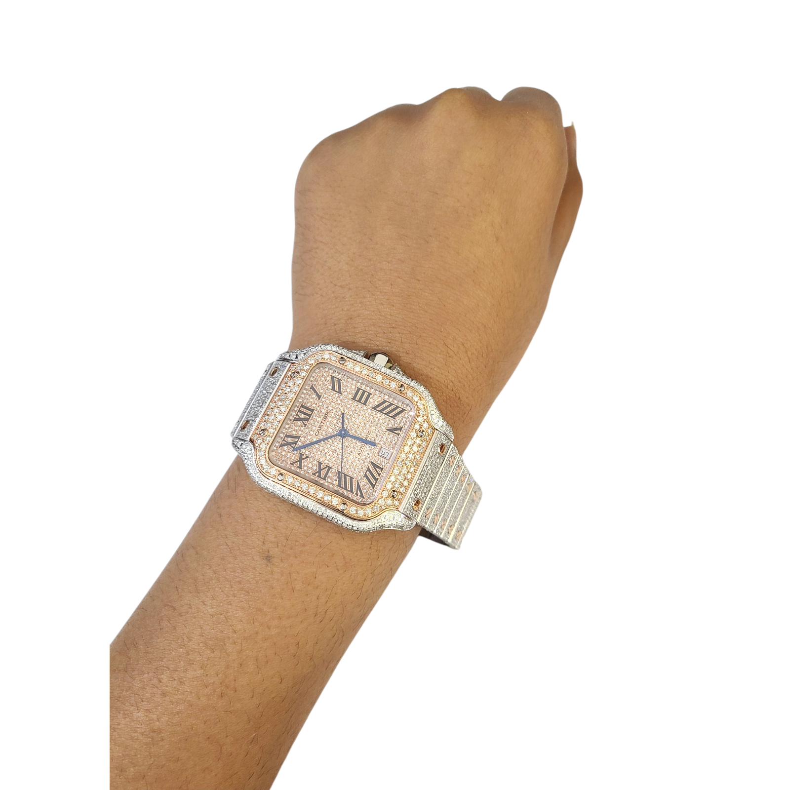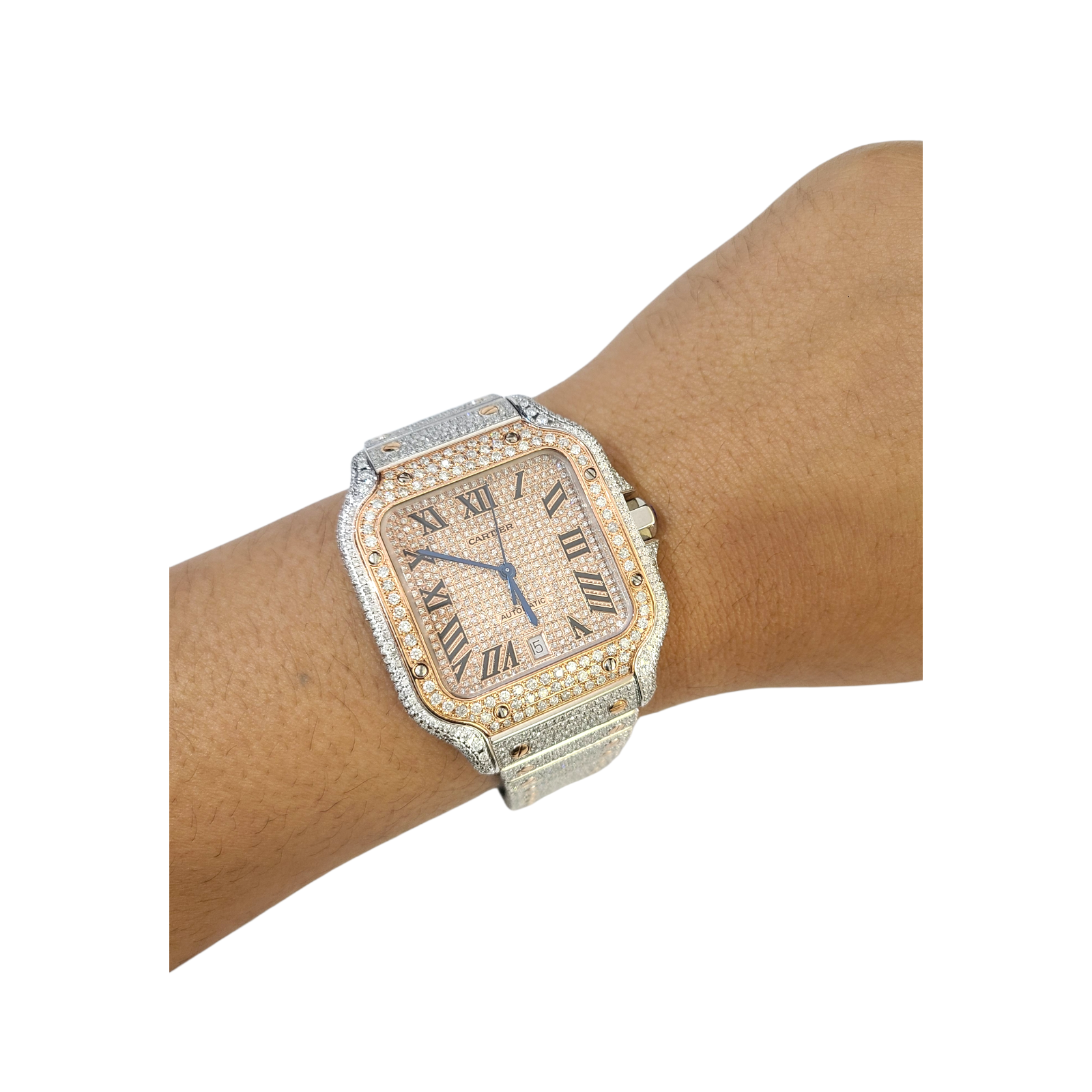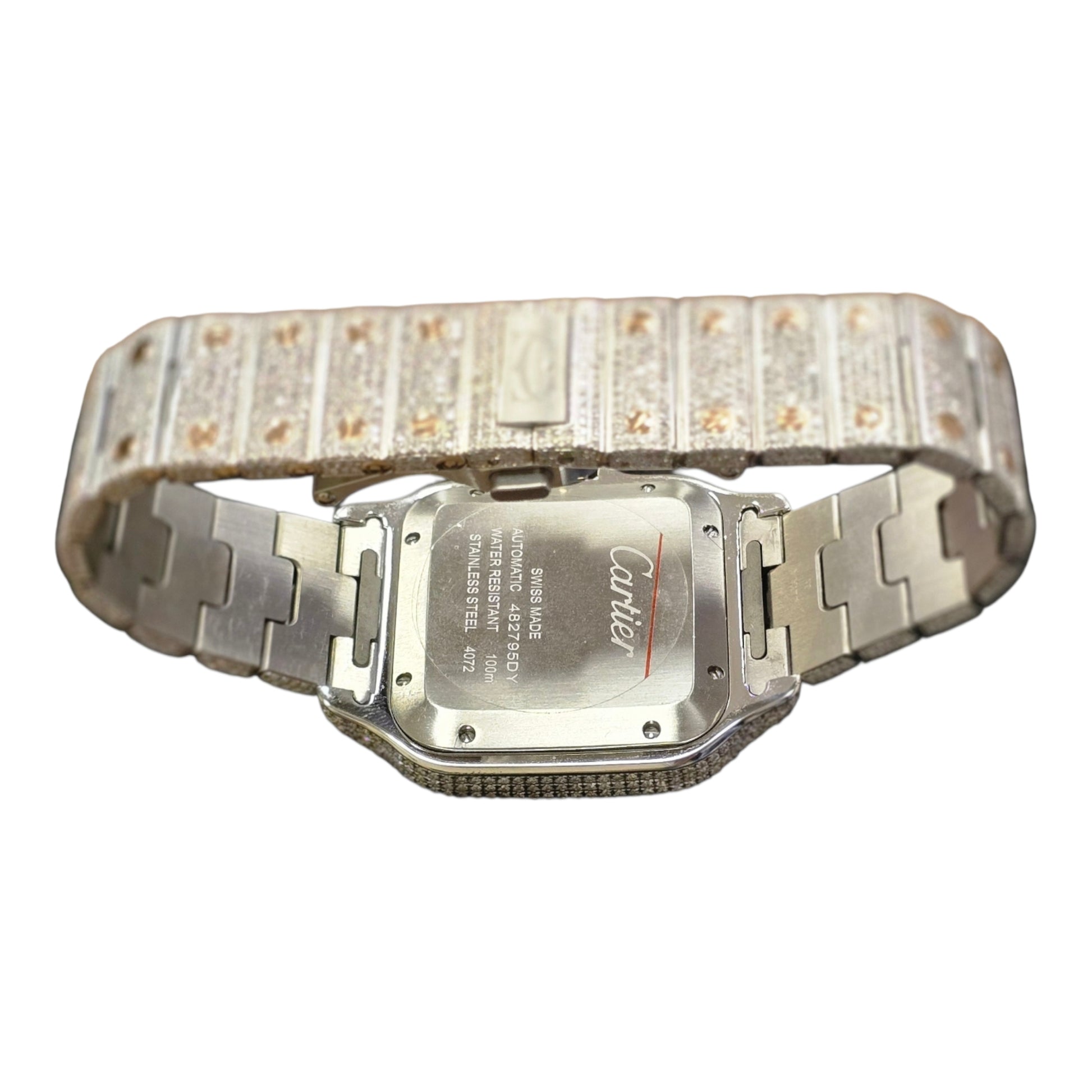 This is a 38.8 mm Stainless steel Cartier watch with Genuine Natural Diamonds of Total weight 12CT with Aftermarket dial , Bazel and a case.