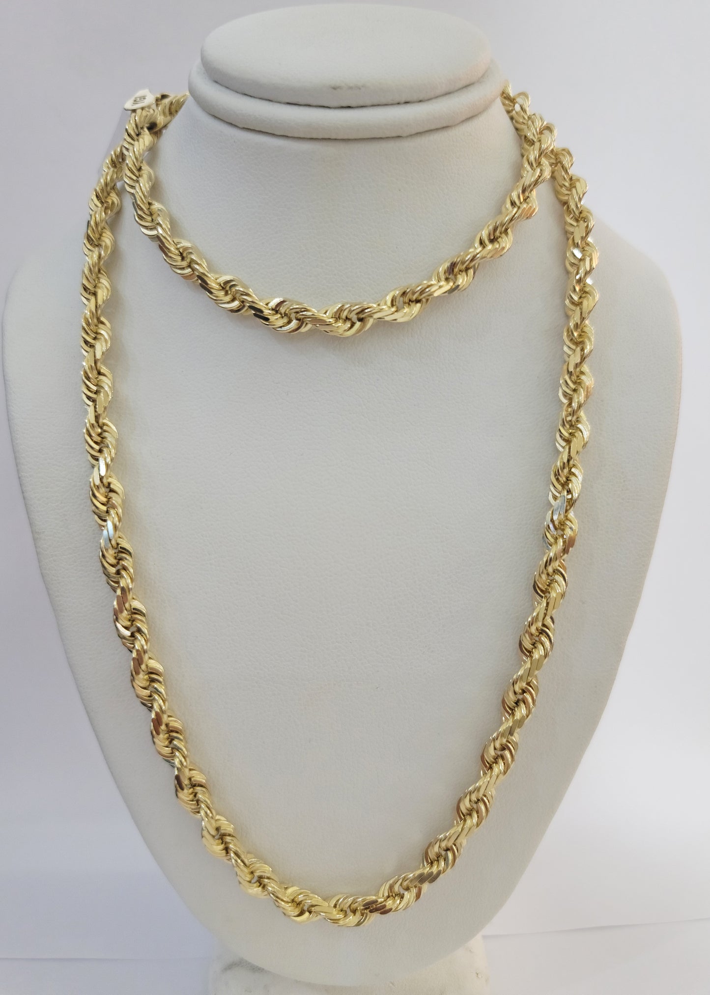Solid (heavy ) Real 14 k Yellow Gold Rope Men's chain Necklace diamond cuts. The Width of the necklace is 6mm (approx.) and Length 24 Inches. The Clasp is lobster. The chain can be worn with the pendants and it is very steady . If you are not happy with the way it looks or feels, we do offer FREE Return shipping. Contact us for more information.