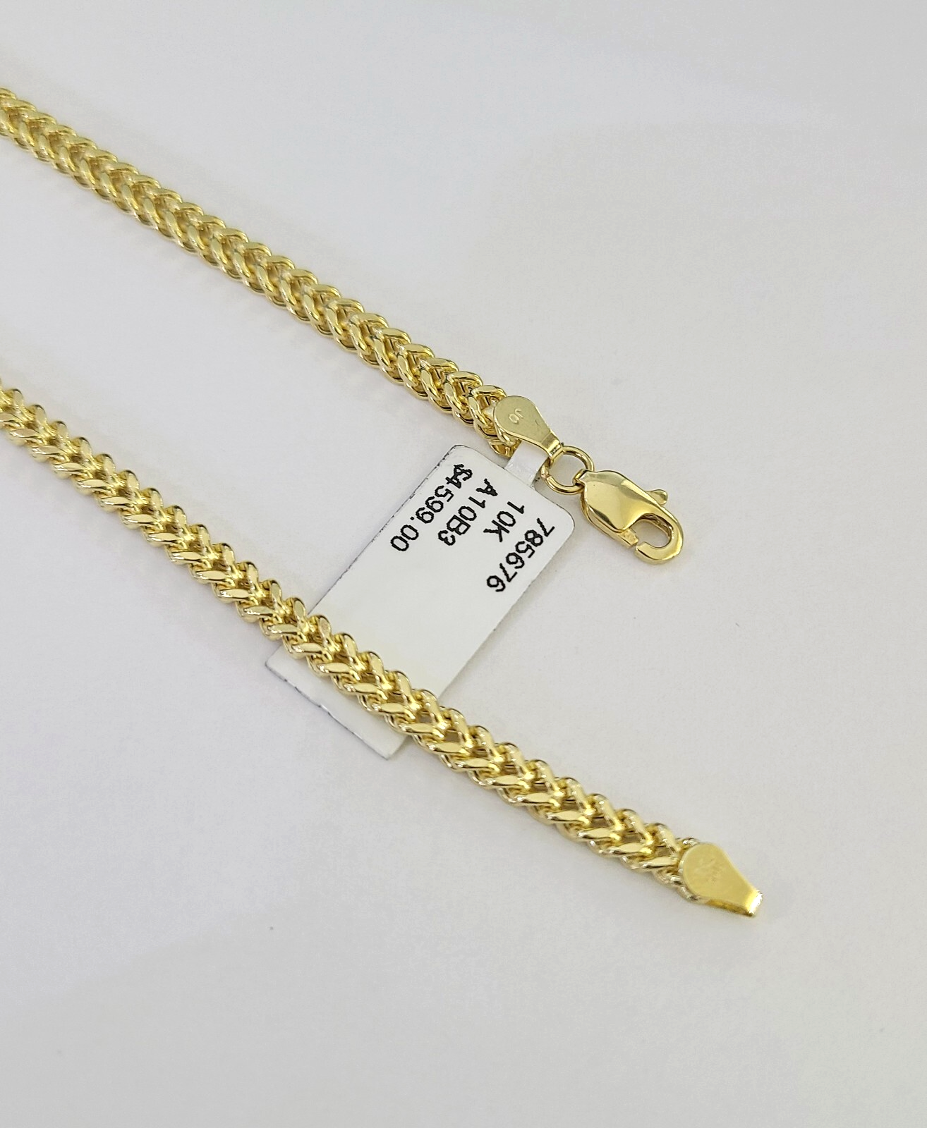 10K Yellow Gold ( Real , Not plated , Not filled ) Franco Chain Necklace. The Width of the Chain is 3mm (approx.) and 22 Inches Long. The Clasp is Lobster Safety Lock which is strong and safe lock for the Chain. The Chain is beautiful designed with Franco Link style that adds more shine to the Chain. If you are not happy with the way it looks or feels, we do offer 30 - Days FREE Return shipping. If the Chain does not fits you then contact us for exchange and just pay the difference before you make up your mind for returning the item. Your satisfaction is our responsibility.