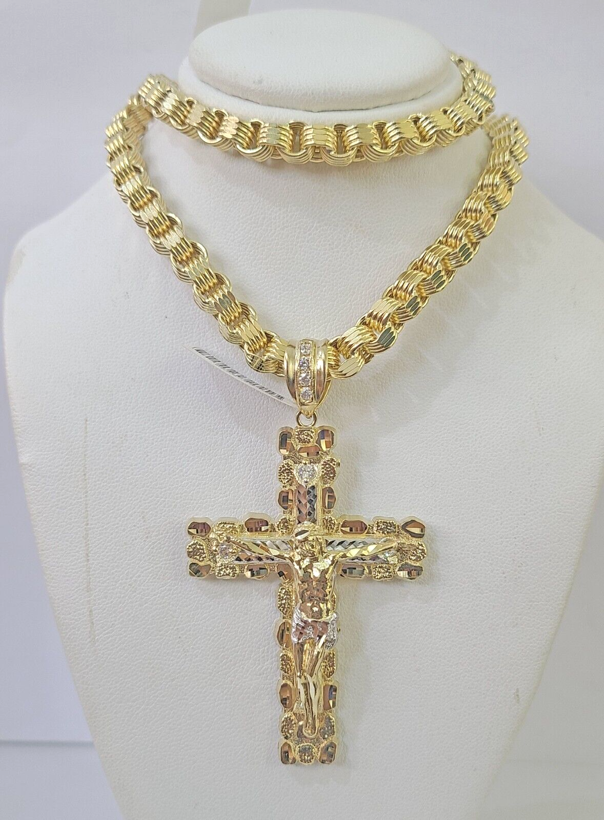 Is Presenting You with This Absolutely Stunning Real 10k Gold Nugget Cross Byzantine Necklace 6mm 24" with Jesus Crucifix cross pendant SET. These Beautiful chains and Pendants will not tarnish, discolor, or fade because they are Pure 10K Gold. We also have them in various another length. Please feel free to contact us if you have any queries regarding the item.