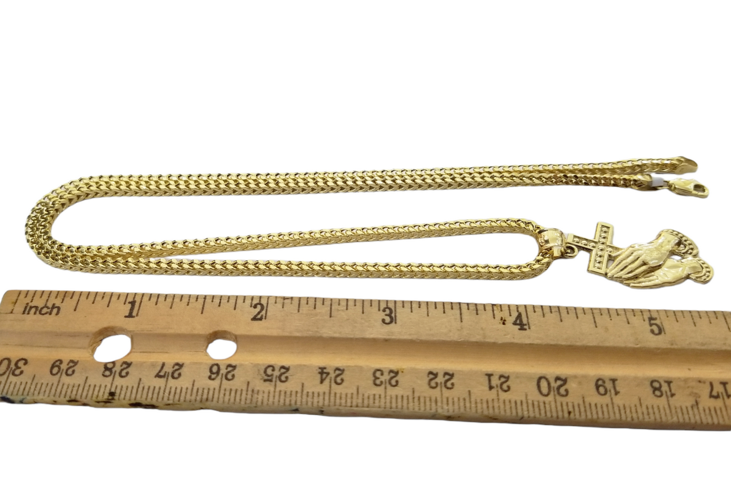 Is Presenting You with This Absolutely Stunning Real 10K Praying Hand With Cross Pendant Charm With 4mm Franco Chain .These Beautiful Chain And Charm will not tarnish, discolor, or fade because they are Pure 10K Gold. We also have them in various another sizes. Please feel free to contact us if you have any queries regarding the item.