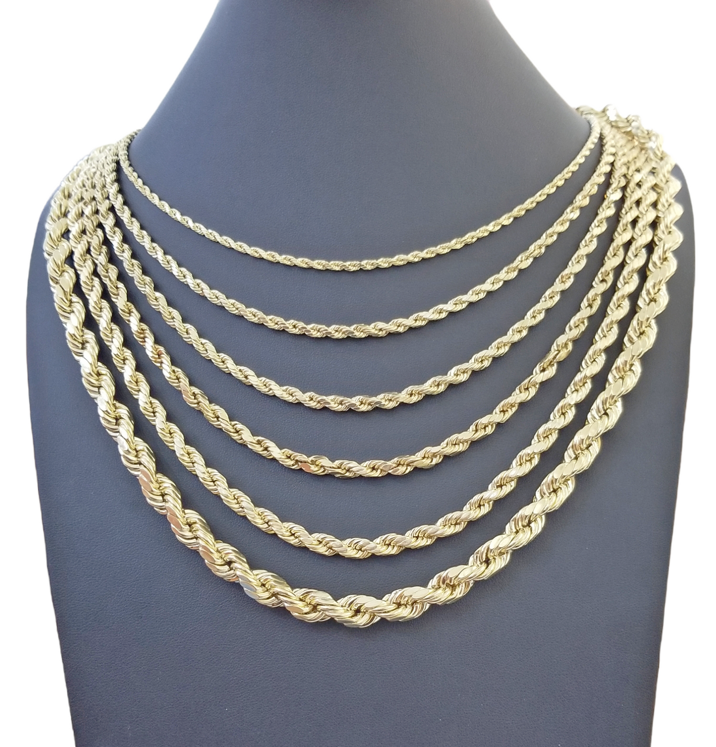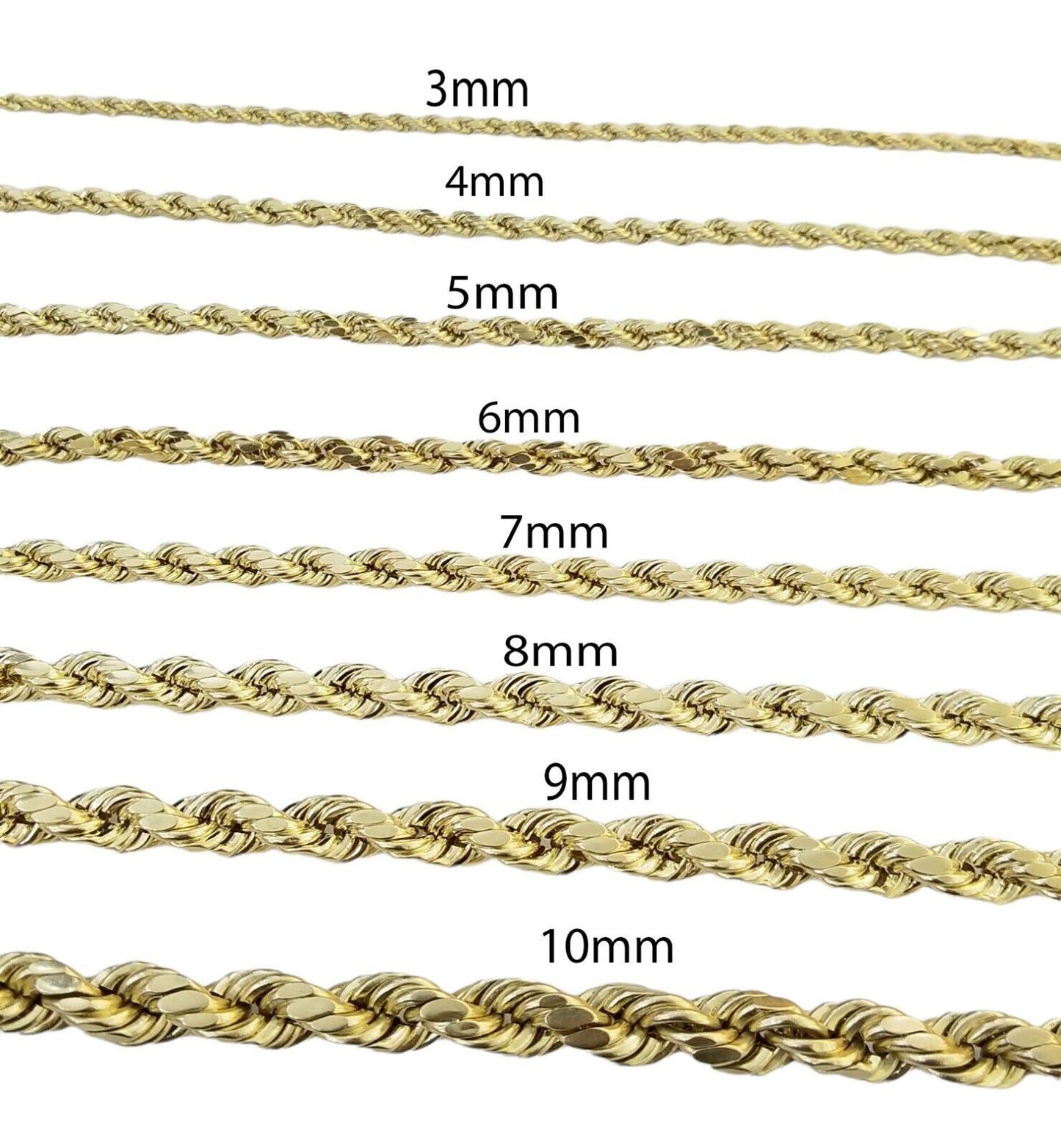 Is Presenting You with This Absolutely Stunning Real 10k Yellow Gold Rope chain 3-10mm, Diamond Cuts and,18-30 Inches in length, lobster clasp. These Beautiful chains will not tarnish, discolor, or fade because they are Pure 10K Gold. We also have them in various another length. Please feel free to contact us if you have any queries regarding the item.