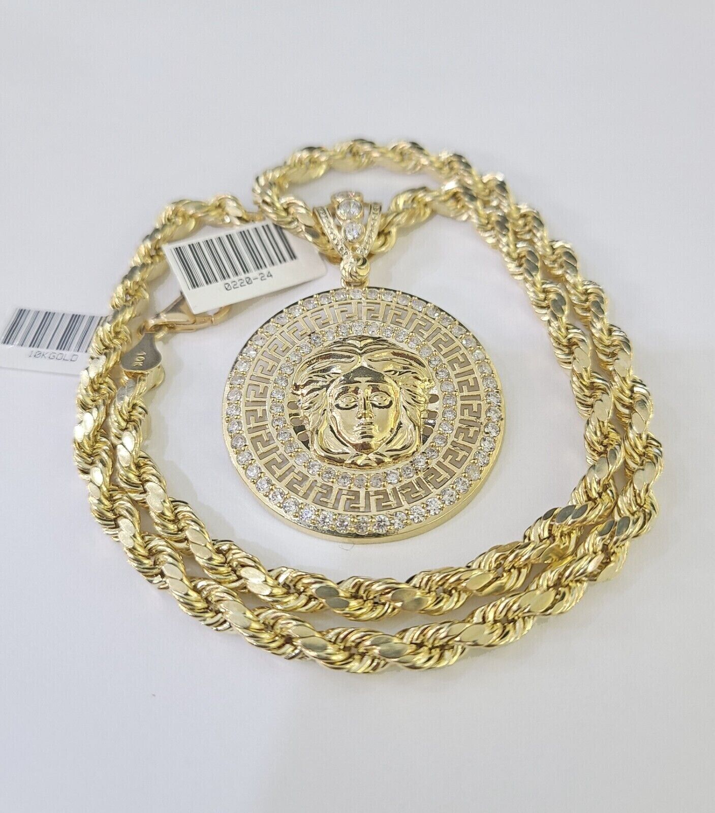 Is Presenting You with This Absolutely Stunning Real 10k Yellow Gold Rope Chain 6mm, 18 inch- 26 inches, Lobster Lock with a 10k Head charm Pendant. These Beautiful chains and Pendant will not tarnish, discolor, or fade because they are Pure 10K Gold. We also have them in various another length and sizes.18"-A9B6