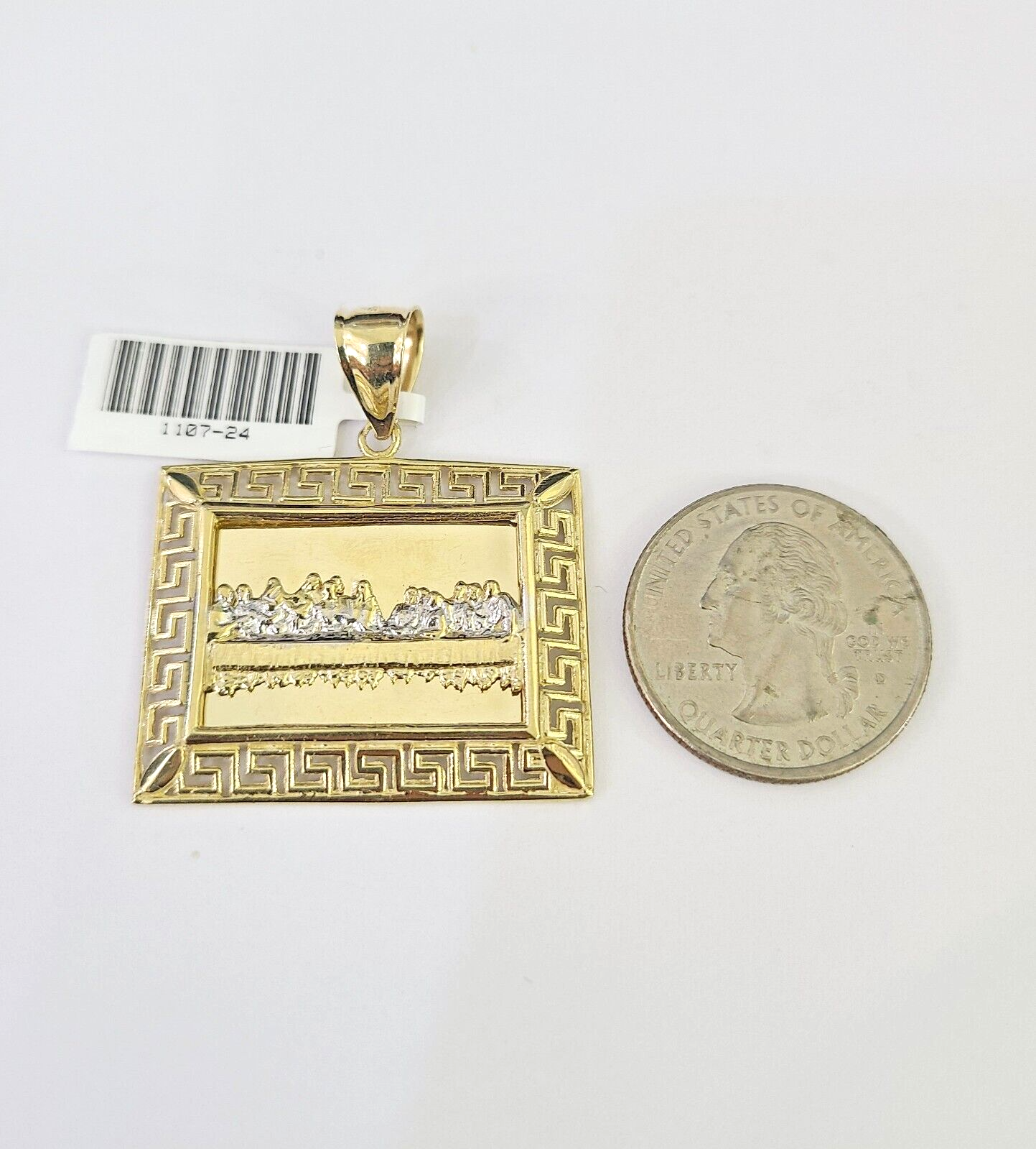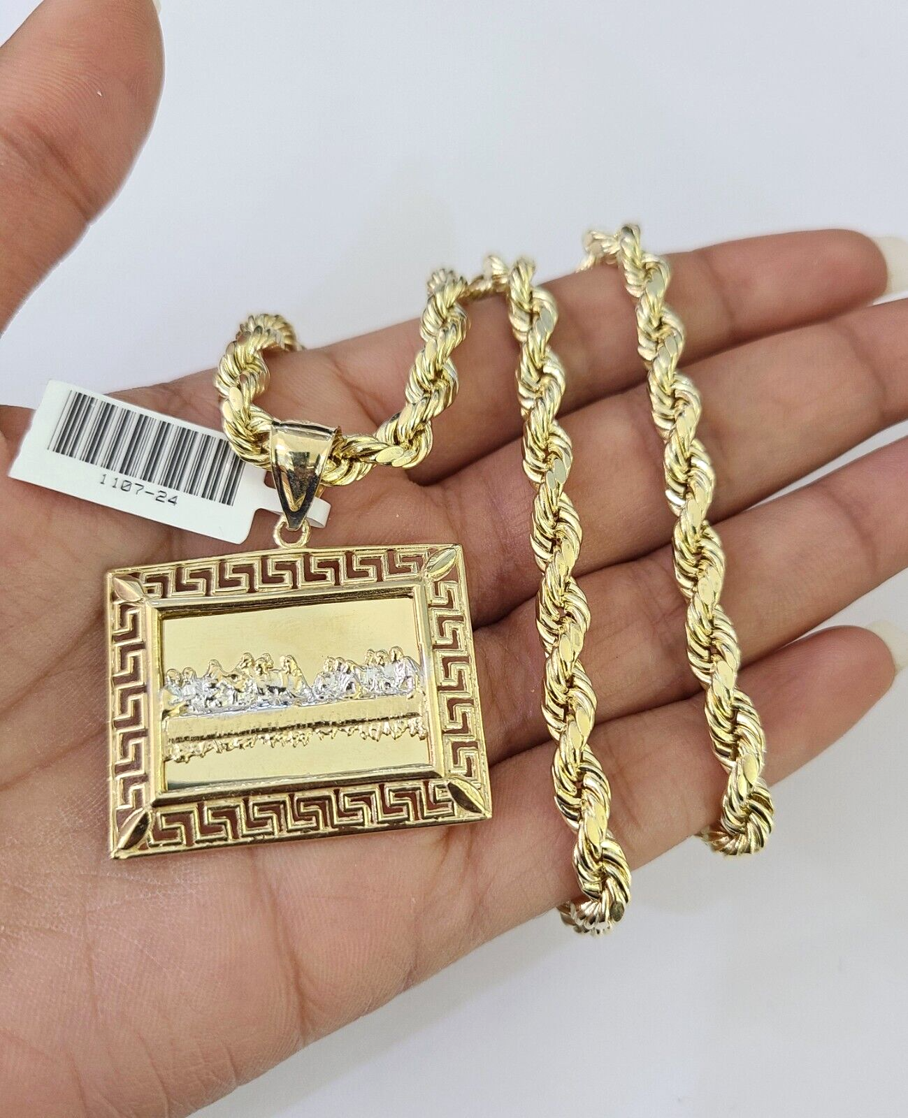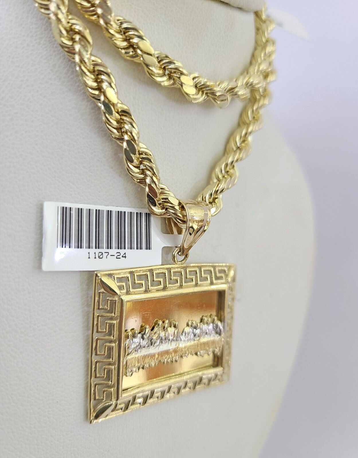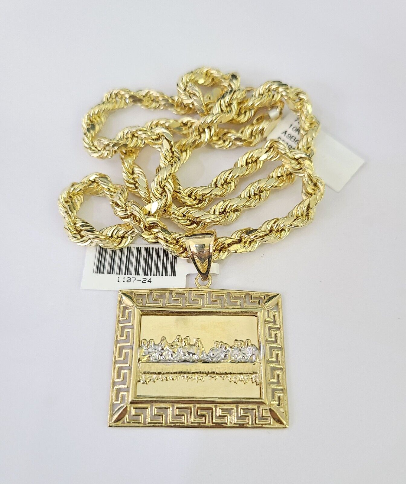 Is Presenting You with This Absolutely Stunning Real 10k Yellow Gold Rope Chain 6mm, 18 inch- 28 inches, Lobster Lock with a 10k Last Supper Pendant. These Beautiful chains and Pendant will not tarnish, discolor, or fade because they are Pure 10K Gold. We also have them in various another length and sizes. 18"-A9B6 A9B0 P12848