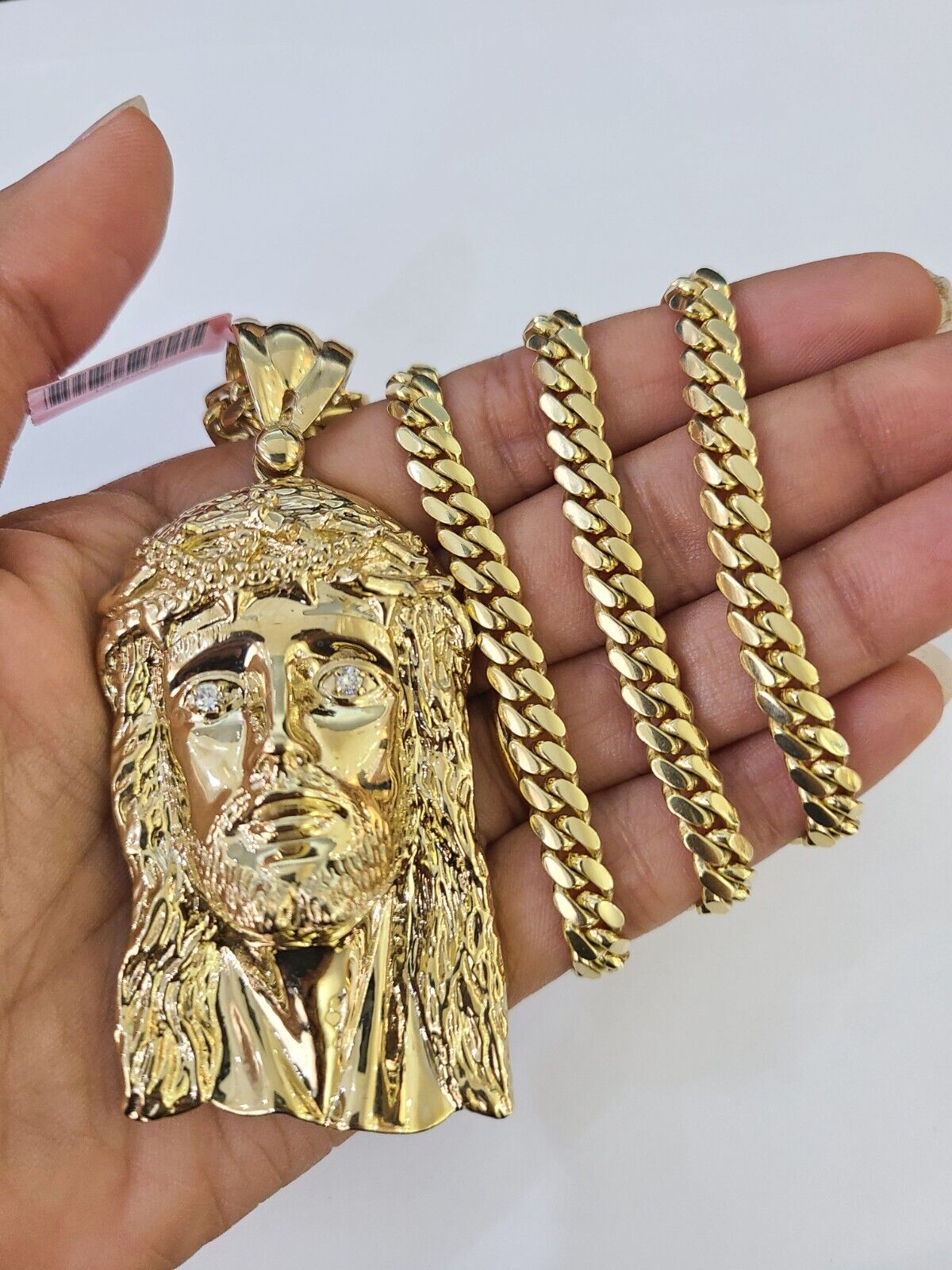 Real 14k Solid Chain Jesus Head Charm Set Miami Cuban Link 6mm Necklace Pendant