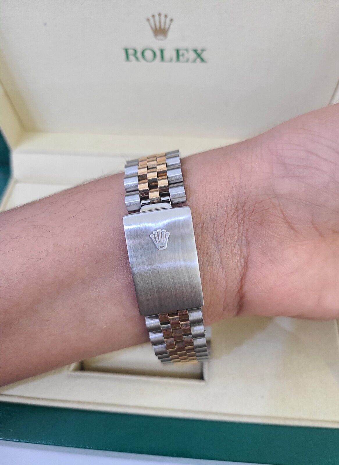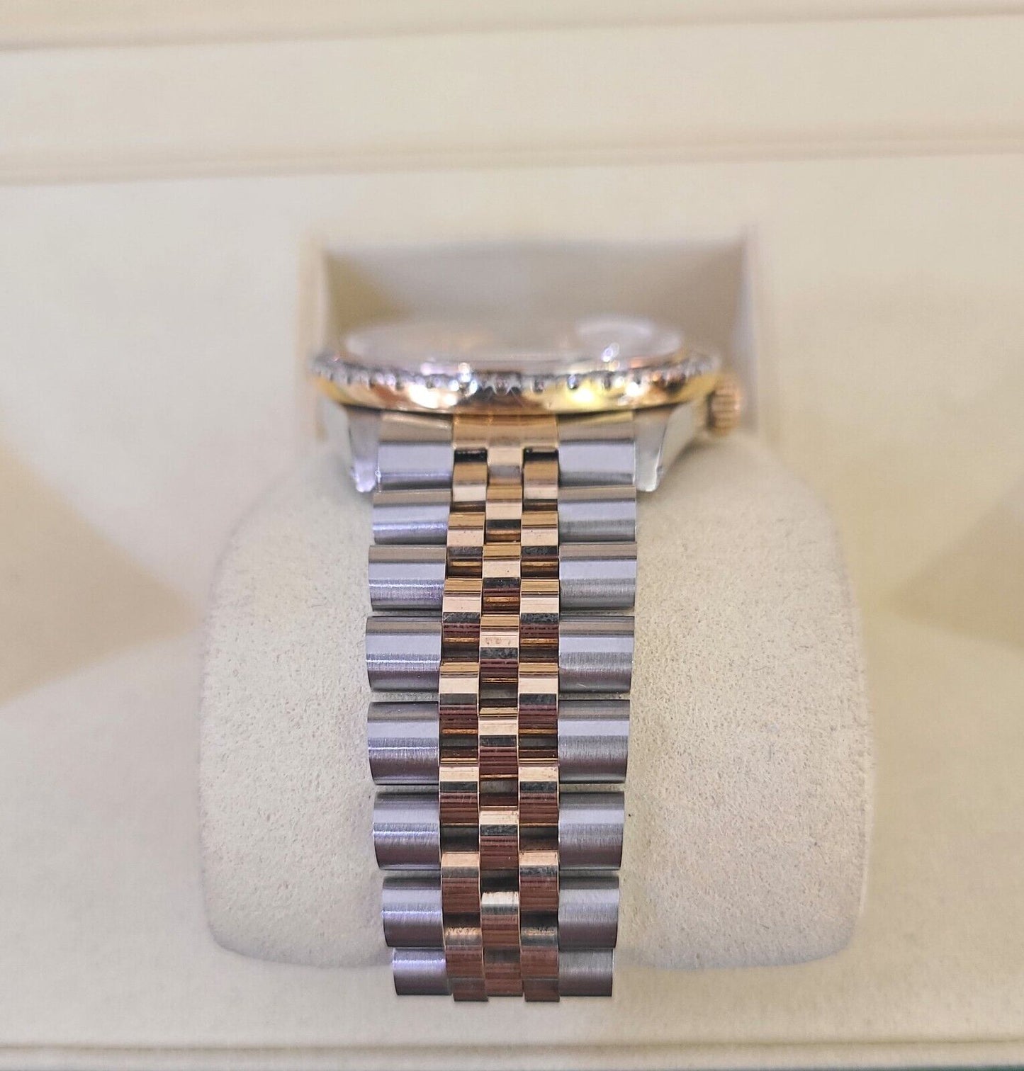 Fluted Custom diamond bezel, Rolex Jubilee band with a deployant closure.